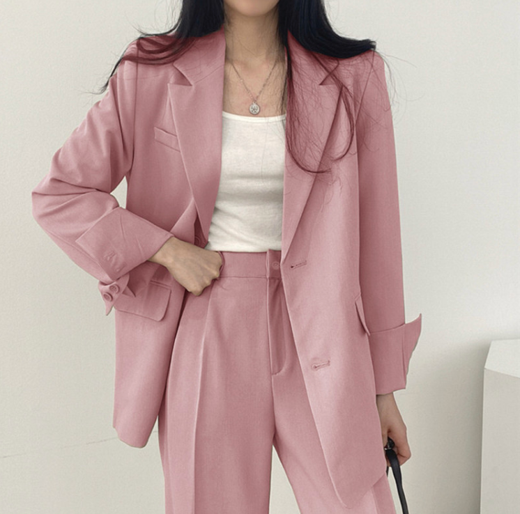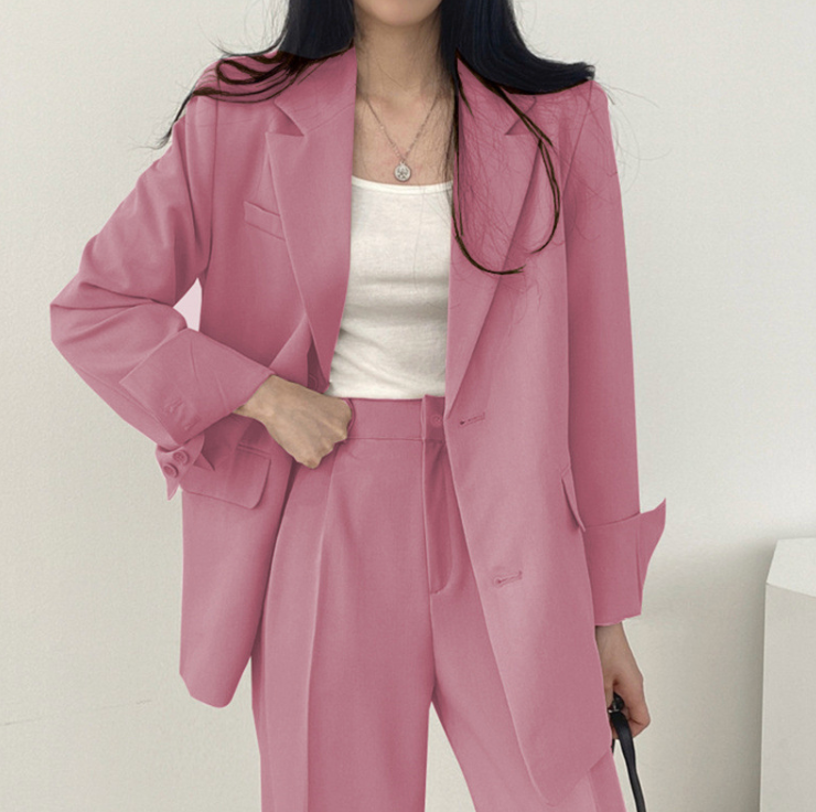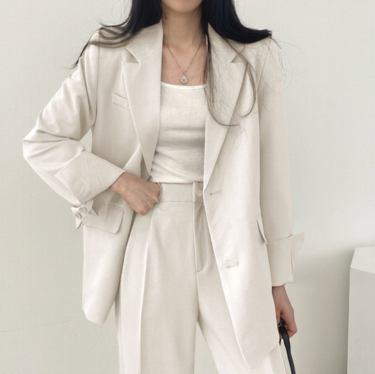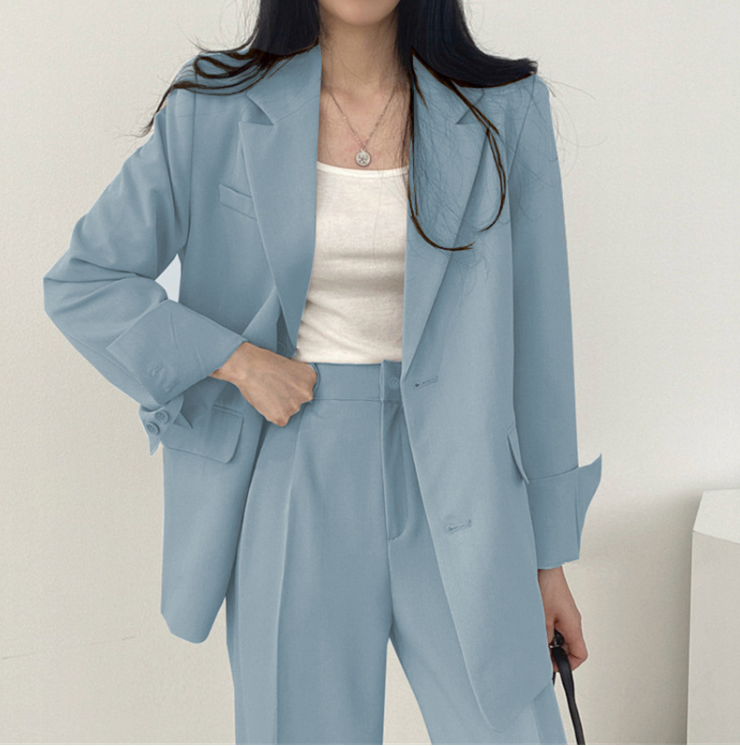 レディース向けフォーマルスーツ。シンプルで洗練されたデザインのジャケットとパンツのセットアップ。