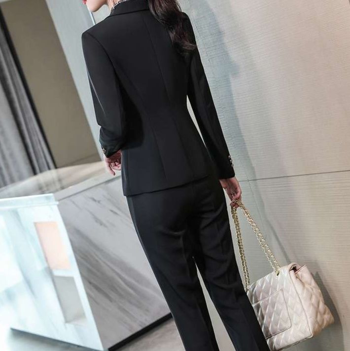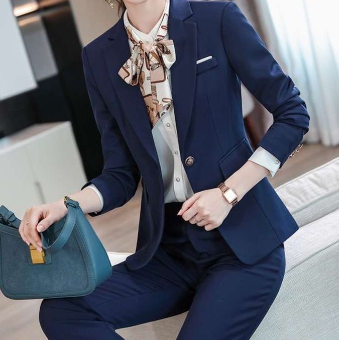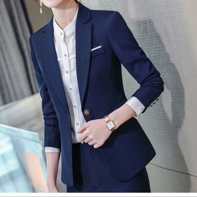 洗練された女性向けフォーマルスーツのセットアップ。シャープなシルエットが際立ち、ビジネスシーンを華やかに演出。白いシャツやスカーフを合わせることで、さまざまなシチュエーションに対応可能。高品質素材を使用し、快適な着心地と美しいラインを実現。自信を持って着こなせる一着として、特別な日にもぴったりです。