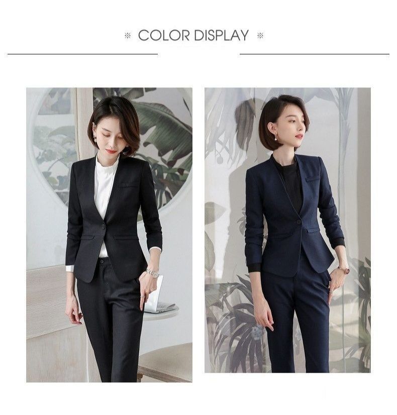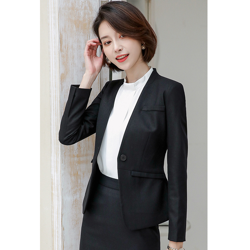 一つボタンのテーラードジャケットとスカートの上品な組み合わせで、ビジネスシーンから式典まで幅広く活躍します。