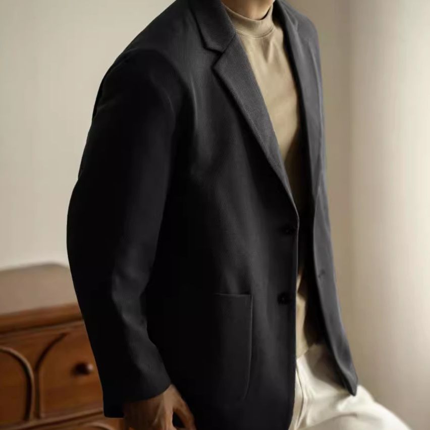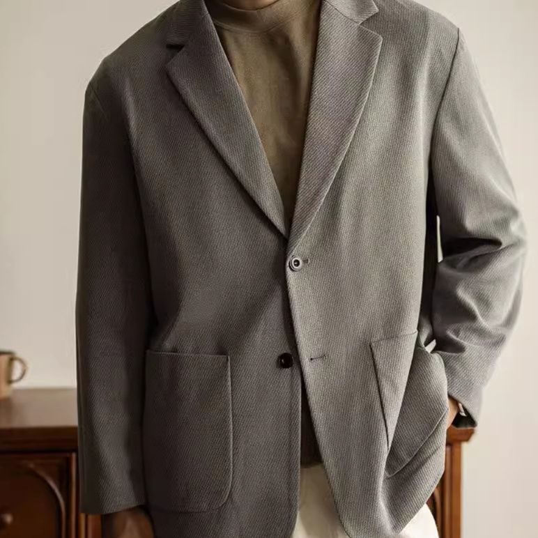 ノッチドラペルと二つボタンのクラシックなデザインで、ビジネスシーンから日常まで幅広く活躍します。