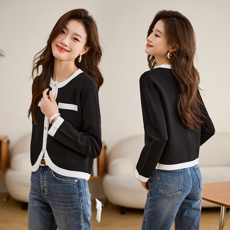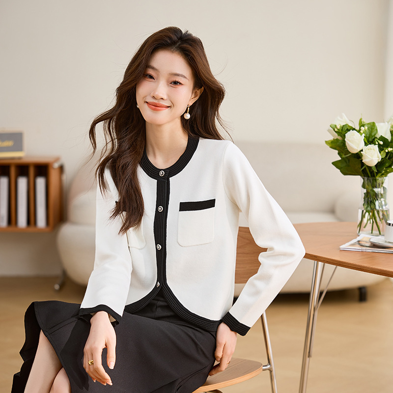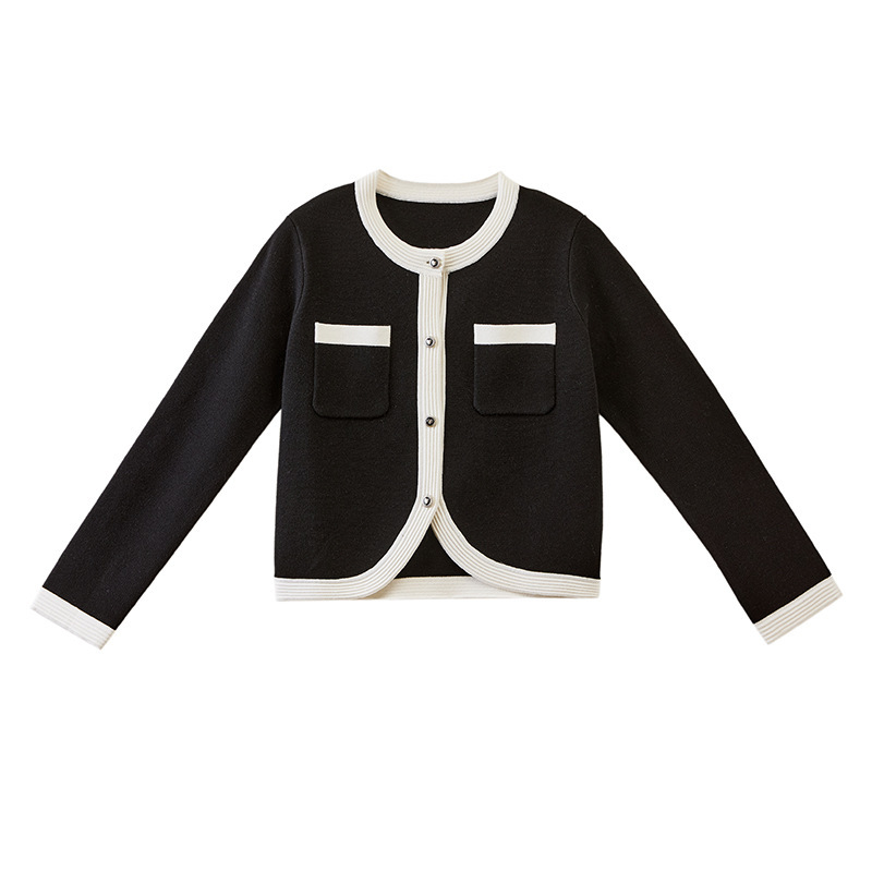 上品な配色パイピングが印象的なノーカラージャケットです。