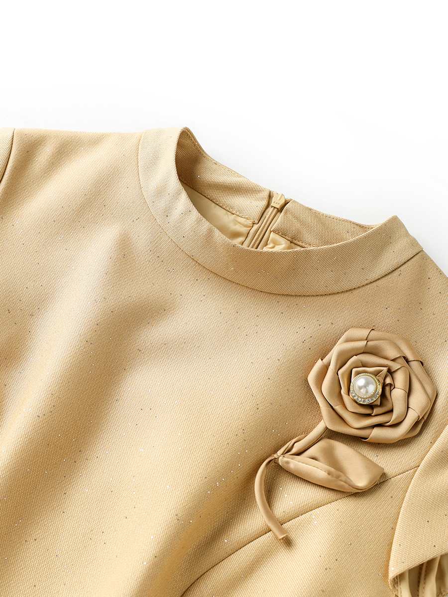 胸元の立体的な花モチーフが華やかさを演出し、結婚式や入学式などの式典に最適なフォーマルスーツです。