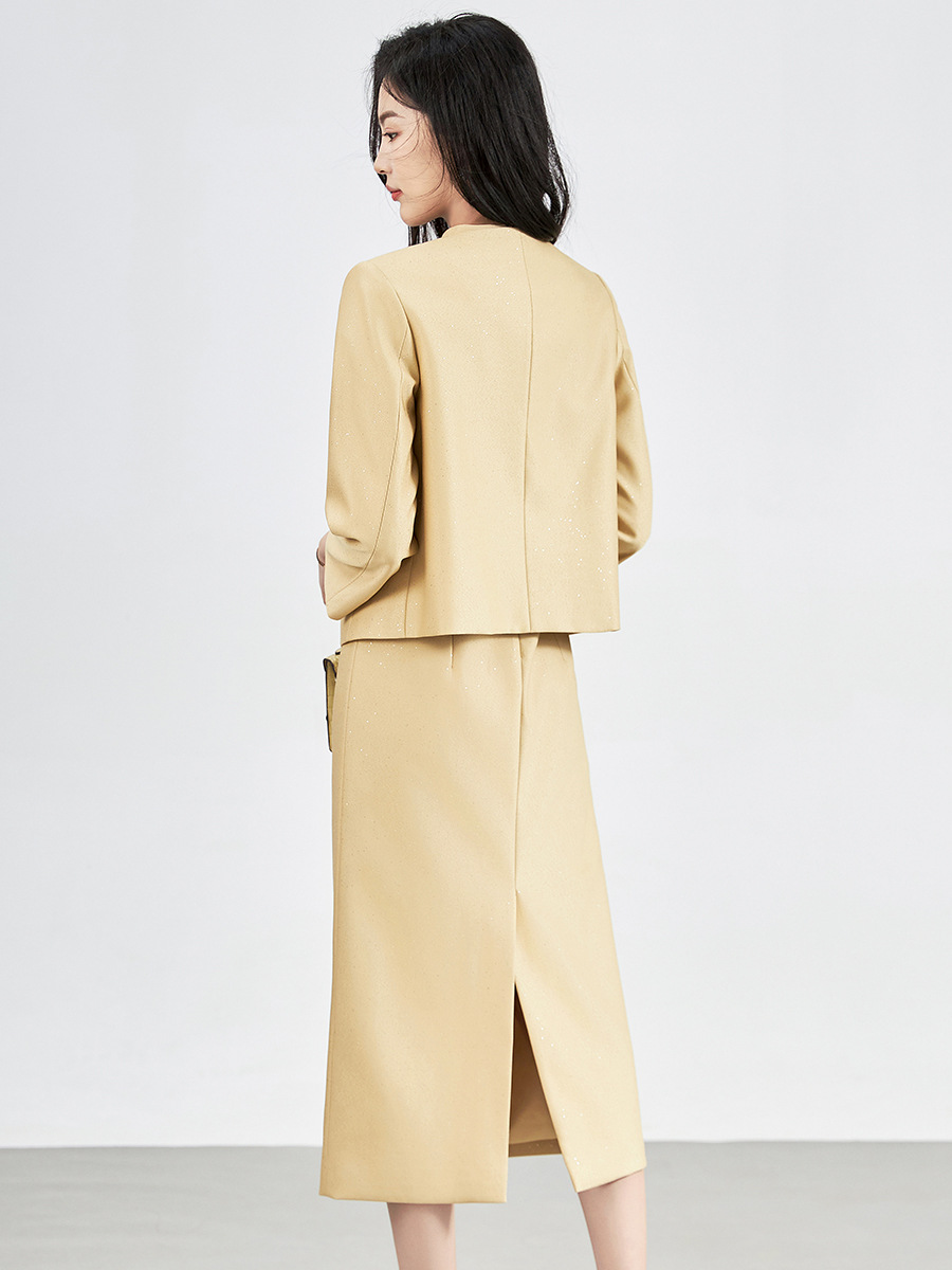 エレガントな花飾りがアクセントのノーカラージャケットとタイトスカートのセットアップです。