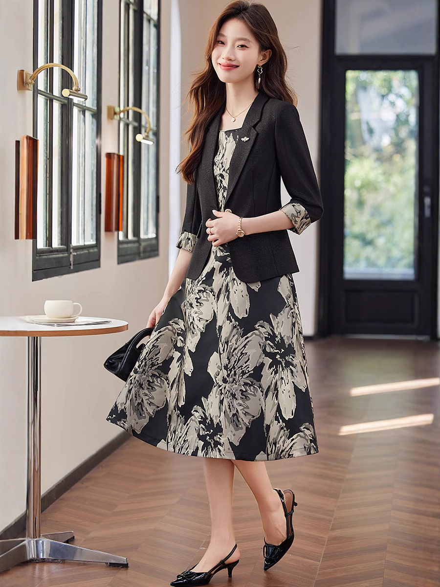 上品な花柄ワンピースとテーラードジャケットの組み合わせが魅力的なレディース向けフォーマルスーツです。
