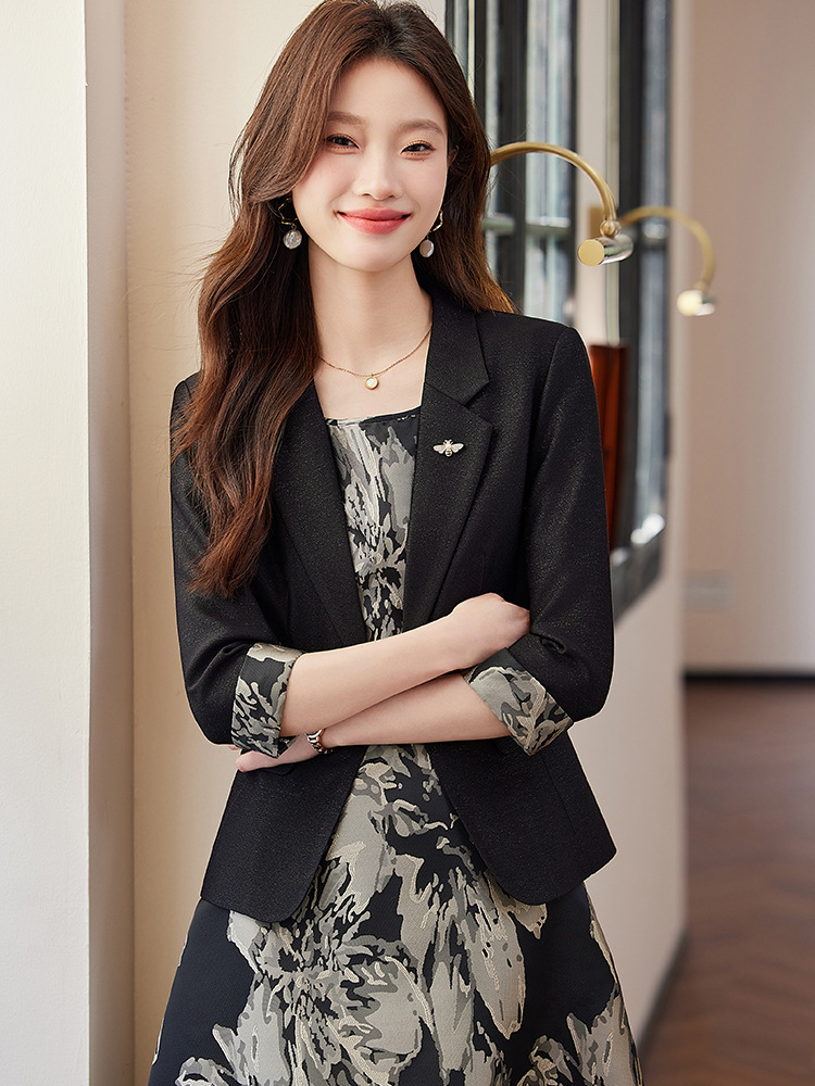 七分袖のジャケットは程よくフィット感があり、洗練されたシルエットを演出します。