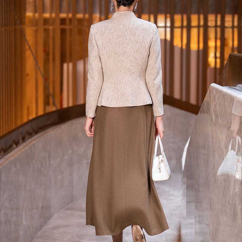 上品なツイード調素材のジャケットと、エレガントなフレアスカートを組み合わせたレディースのフォーマルスーツです。