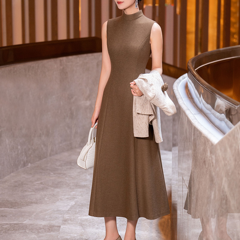 ウエストラインを美しく見せるシルエットと、ミディ丈のスカートが女性らしさを引き立てます。