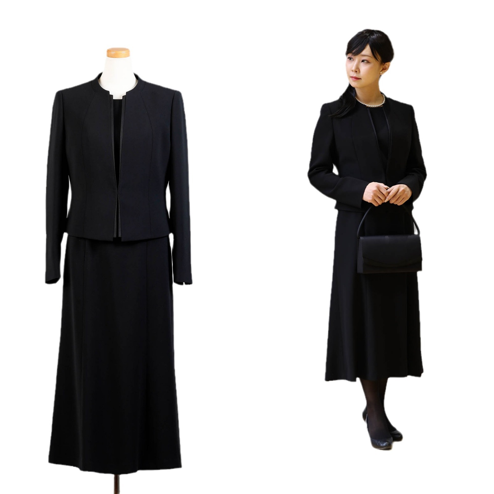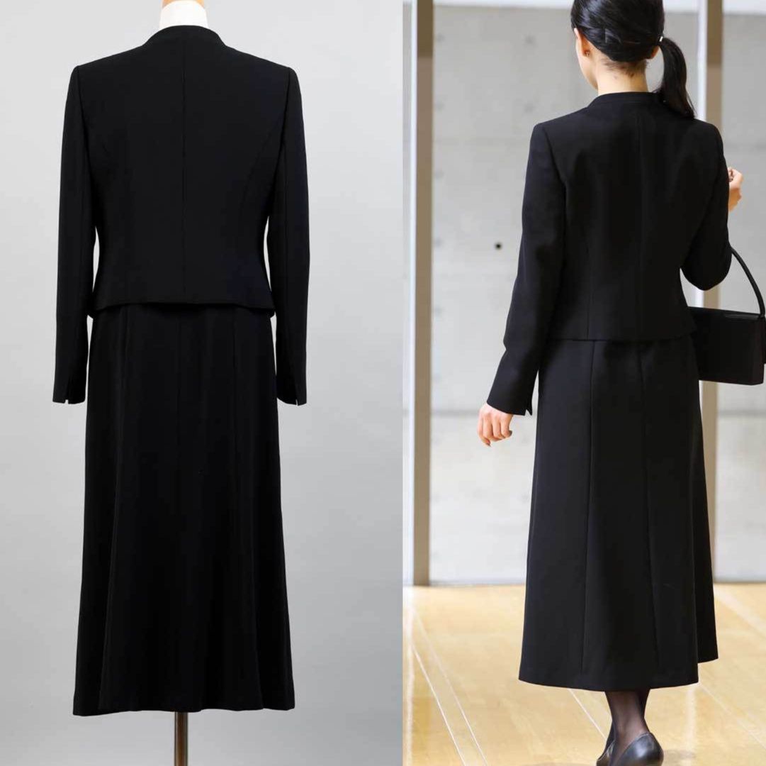 フォーマルスーツとして洗練されたシルエットを保ちながら、喪服に求められる格式と品位を兼ね備えています。