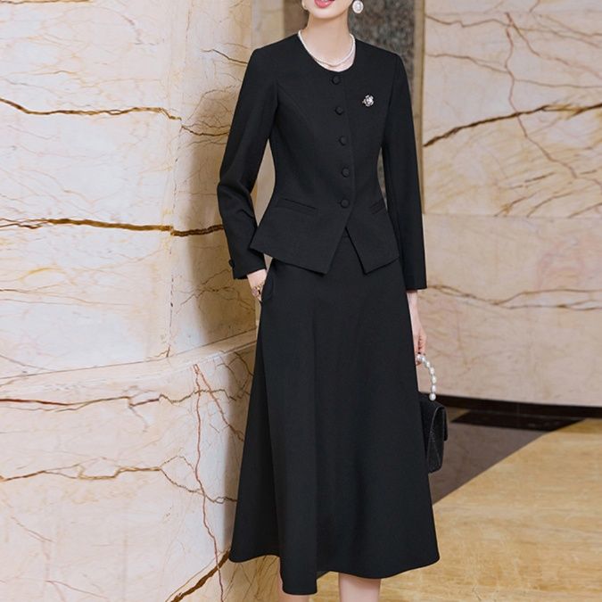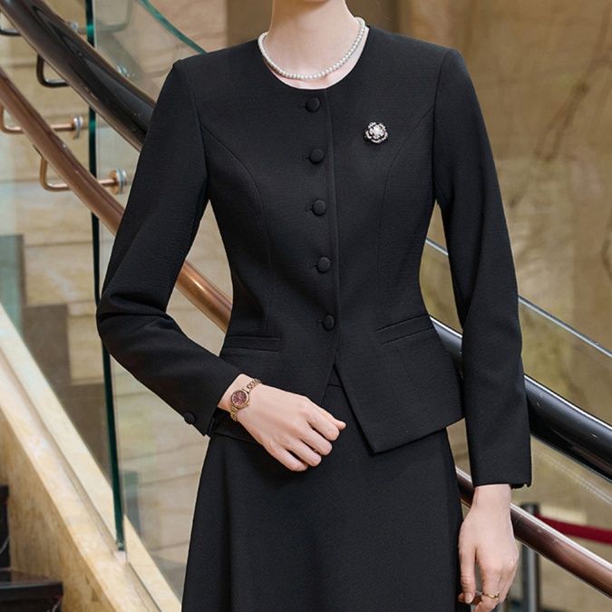 上品なノーカラーデザインが特徴のフォーマルスーツです。