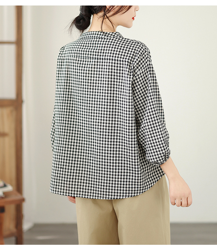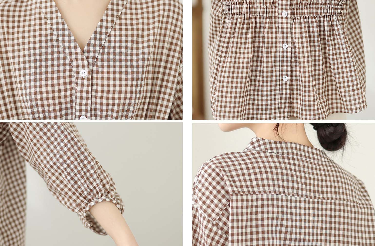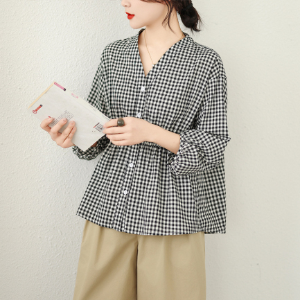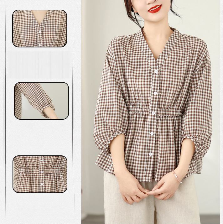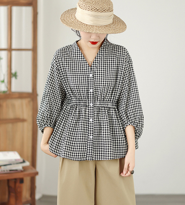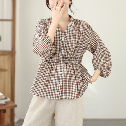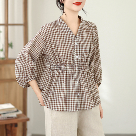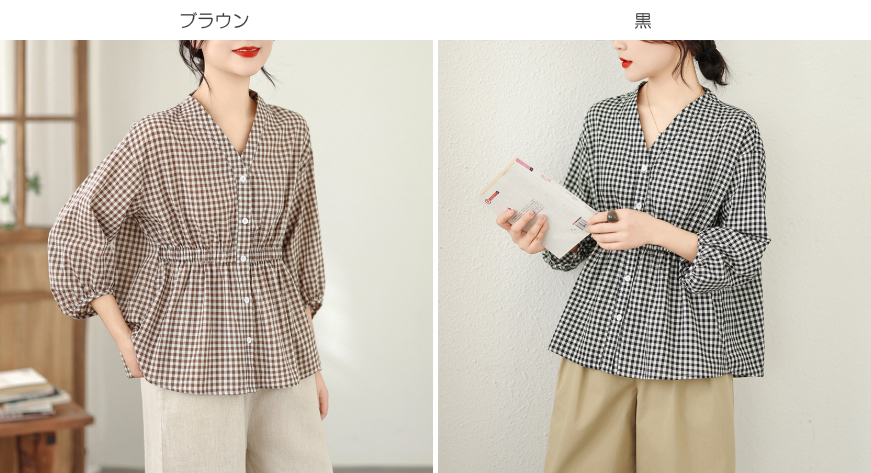 上品なギンガムチェック柄が魅力的なブラウスです。