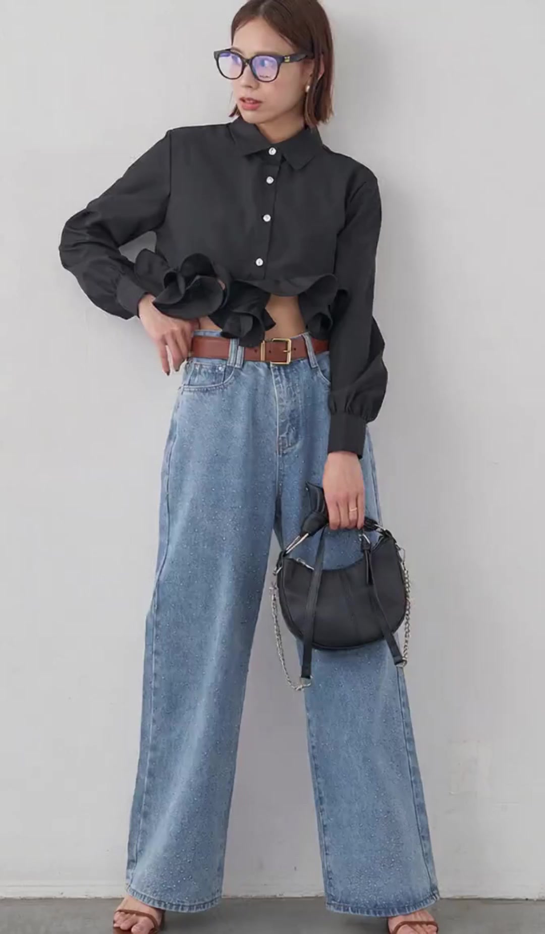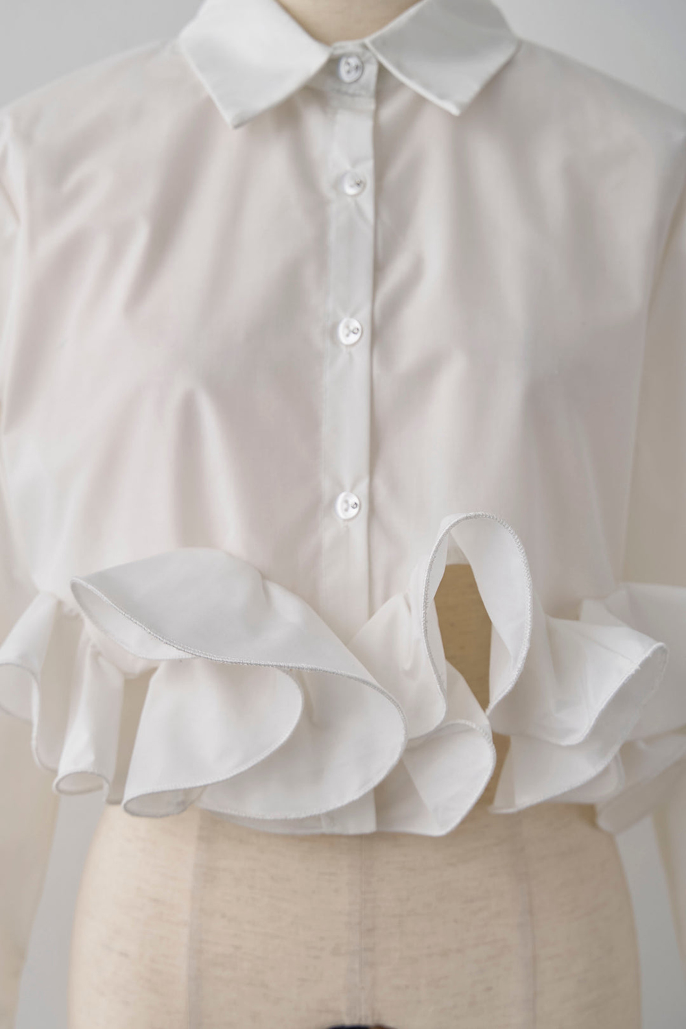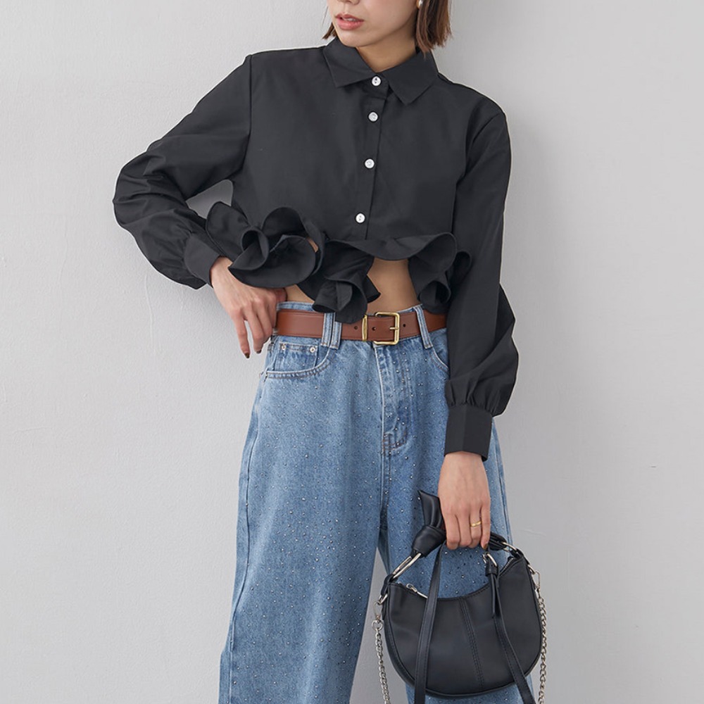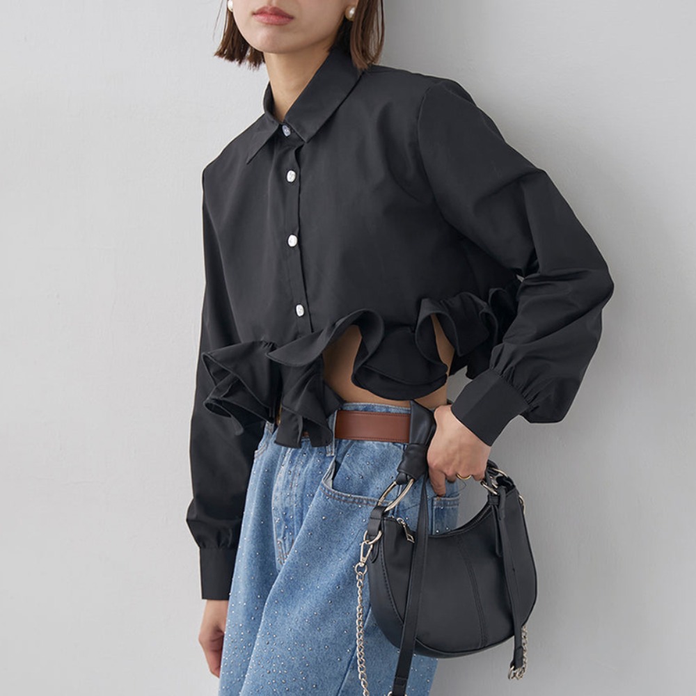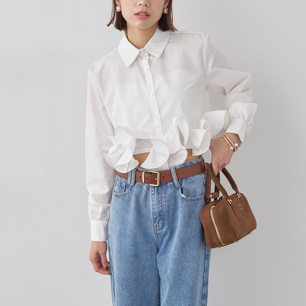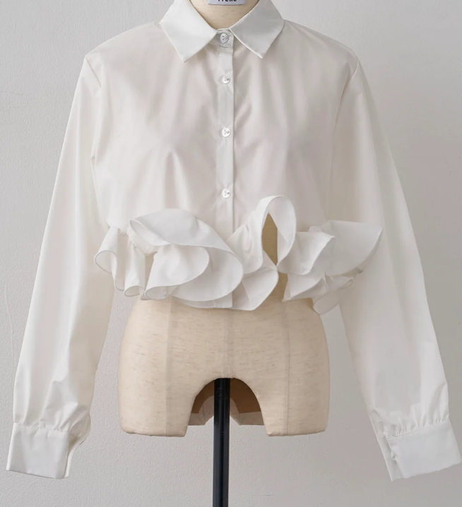 上品な袖フリルが印象的なシャツブラウスです。 袖口の立体的なフリルデザインが女性らしさを演出し、フォーマルスーツとの相性も抜群。 オフィスからカジュアルまで幅広いシーンで活躍するブラウスです。 洗練されたシルエットで大人の魅力を引き立てます。