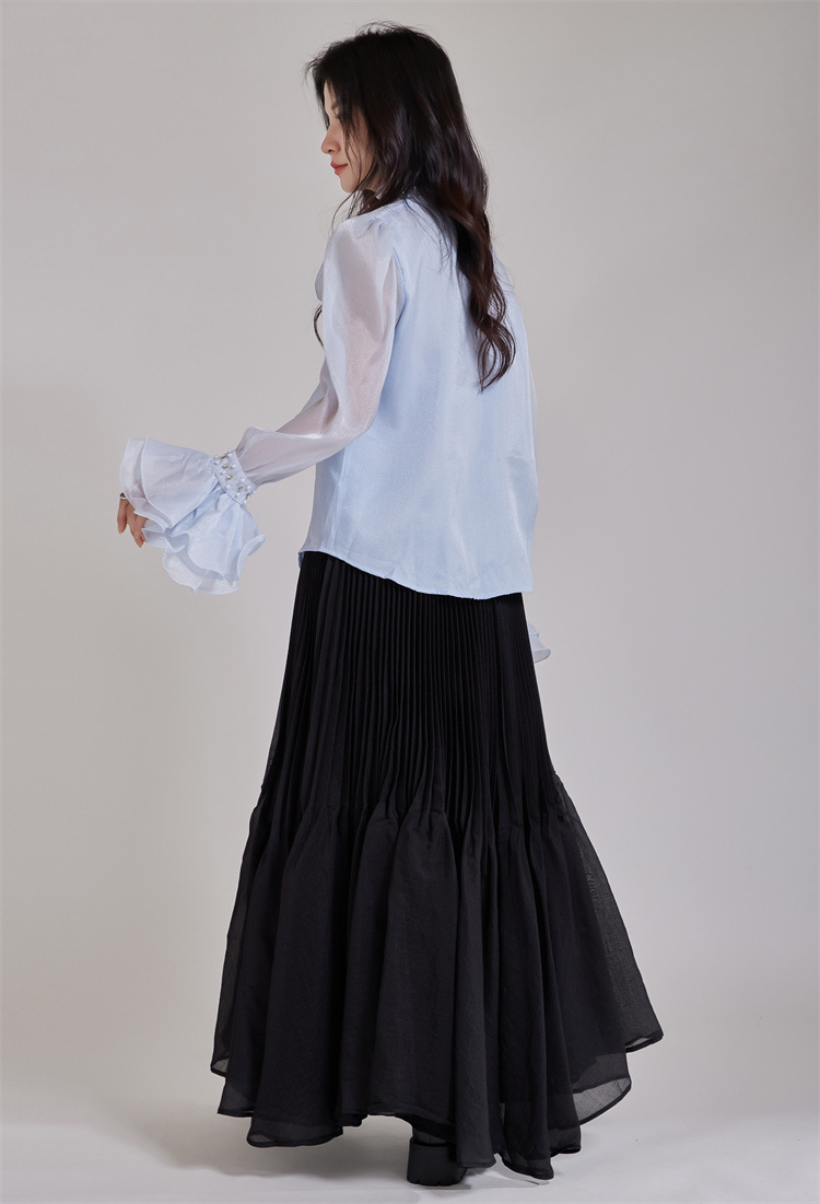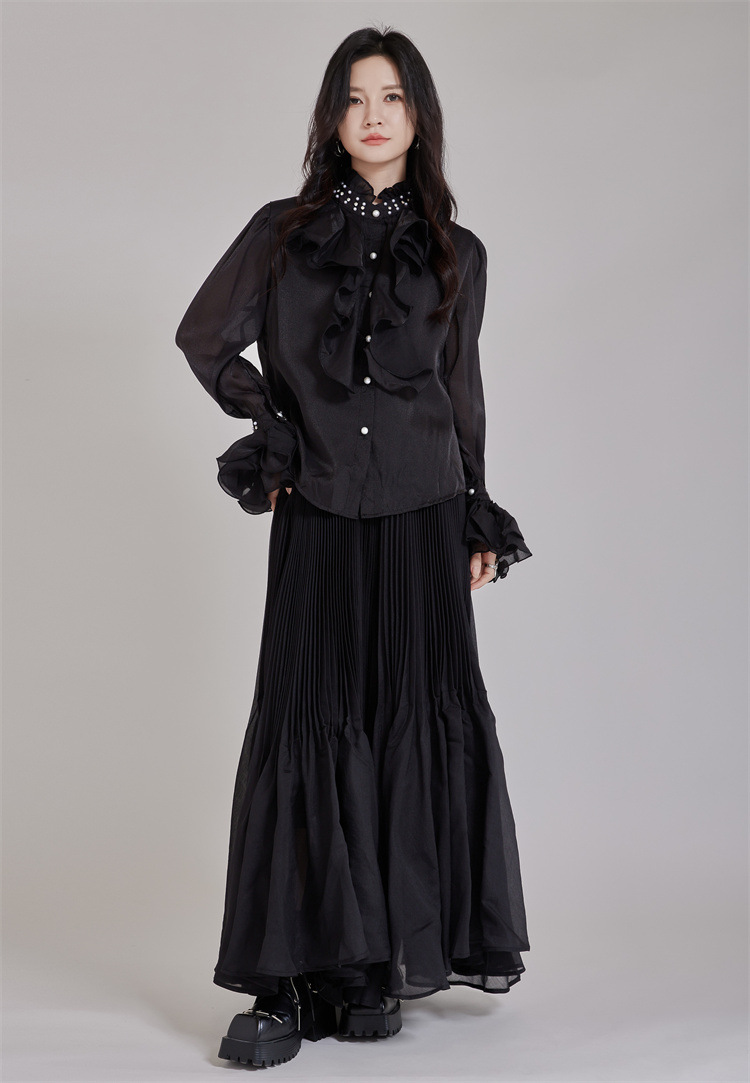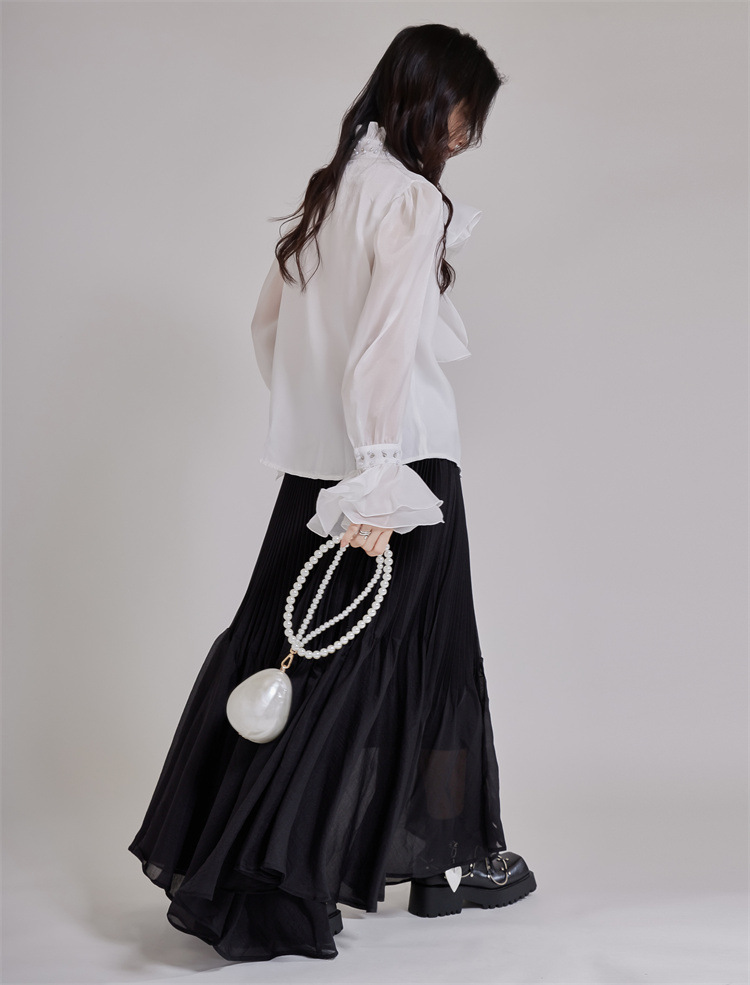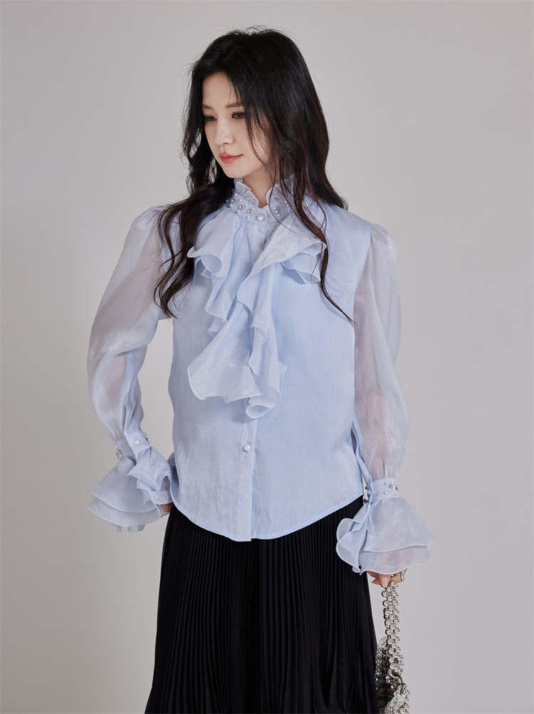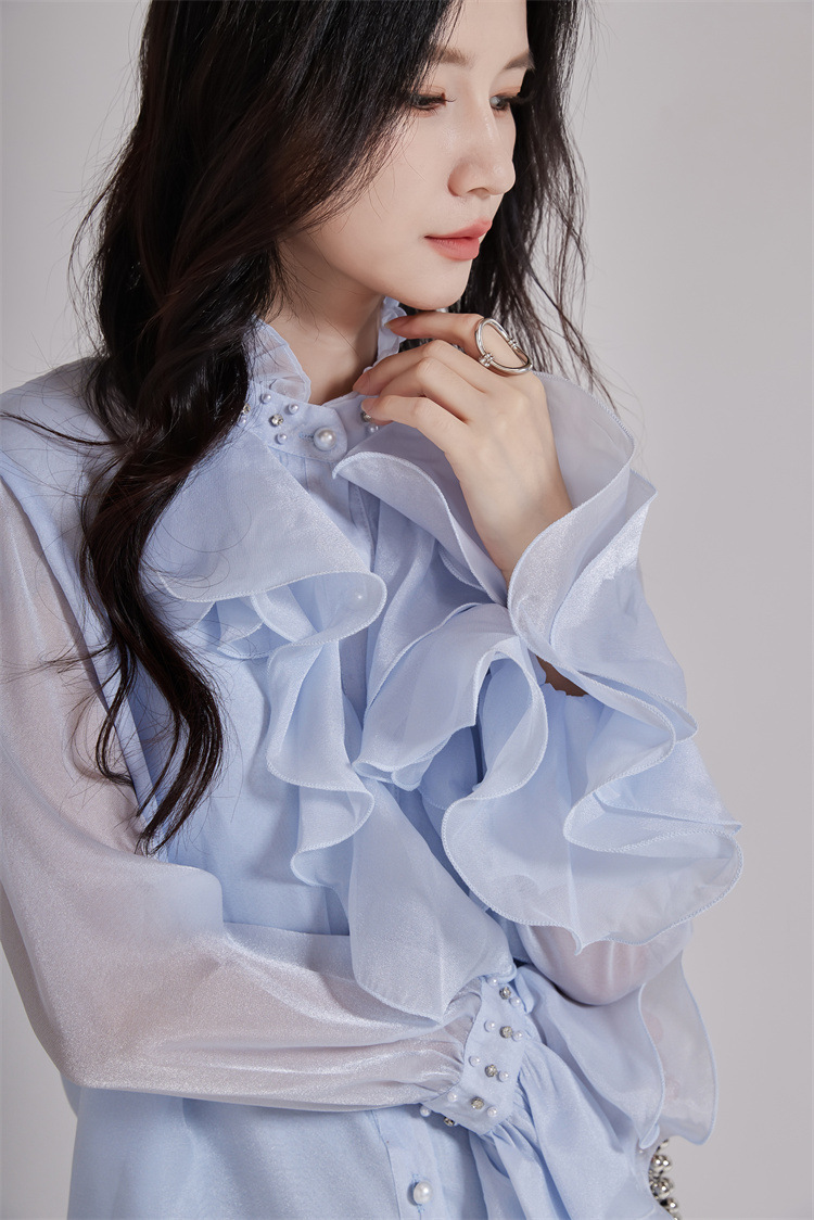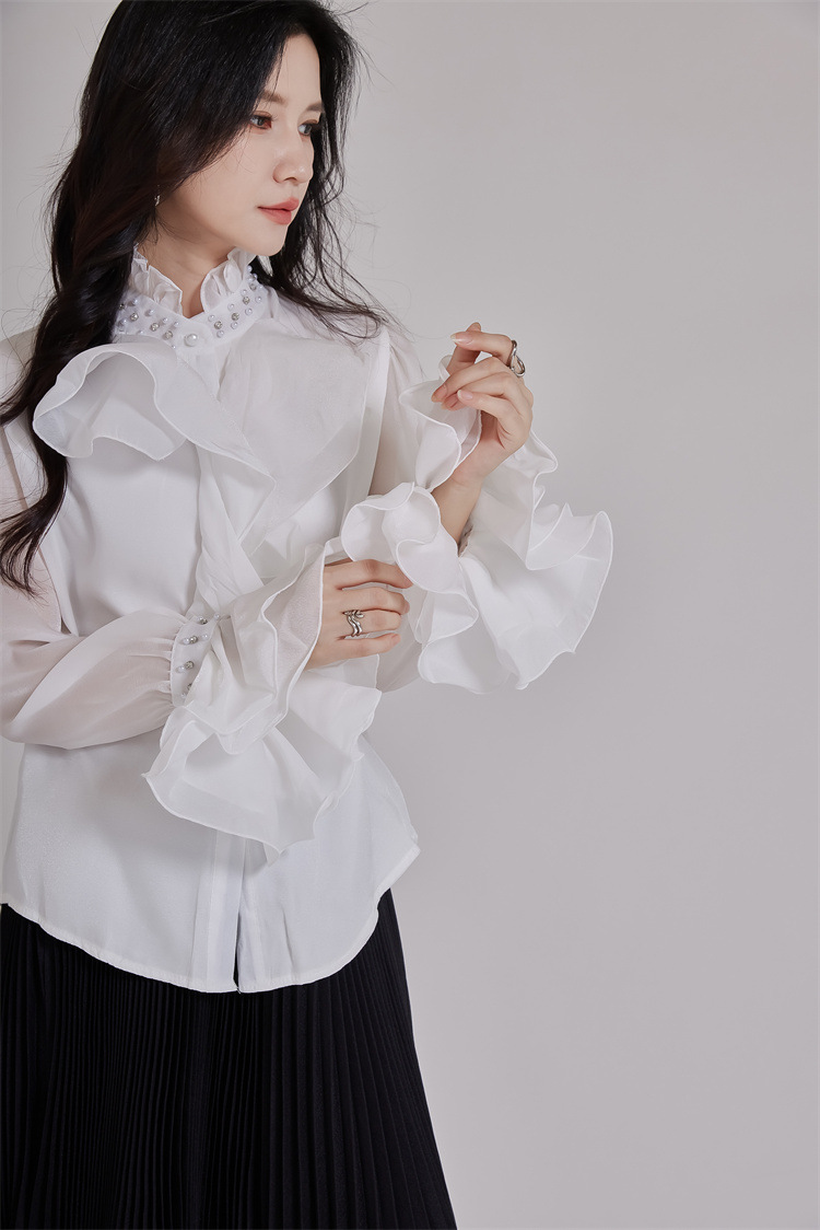エレガントなパール装飾とたっぷりフリルが印象的なブラウスです。 襟元と袖口の繊細なビーズ使いが上品さを演出し、フォーマルスーツにも最適。 透け感のある袖とボリュームフリルで女性らしさを表現。 通勤や特別な日にふさわしい洗練されたデザインです。