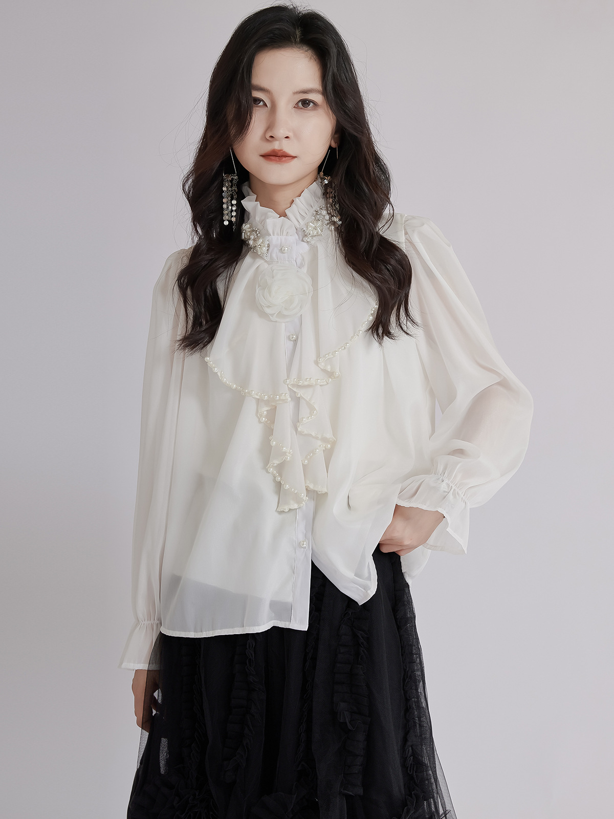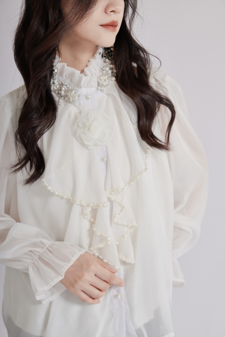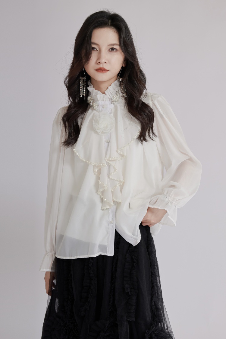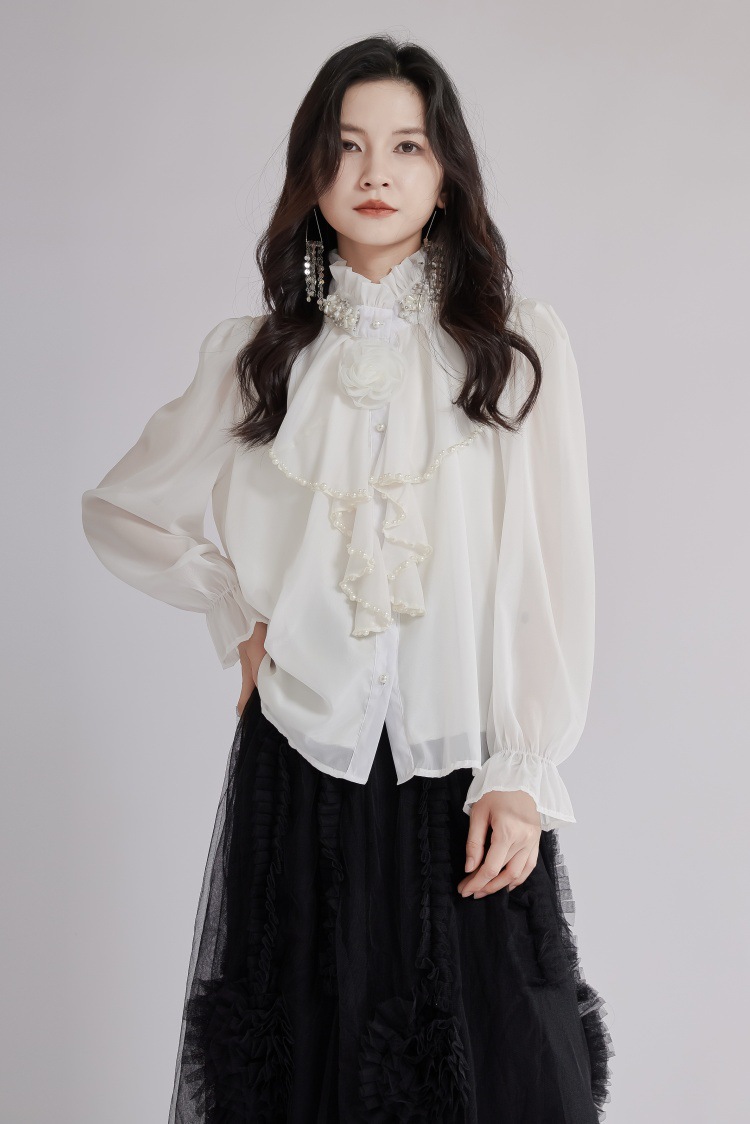 エレガントな立体花モチーフとフリル襟が印象的なブラウスです。 透け感のある上質な生地と繊細なレース使いで、フォーマルスーツにも合わせやすい一枚。 袖口のギャザーデザインが女性らしさを演出し、オフィスから特別な日まで幅広くご活用いただけます。