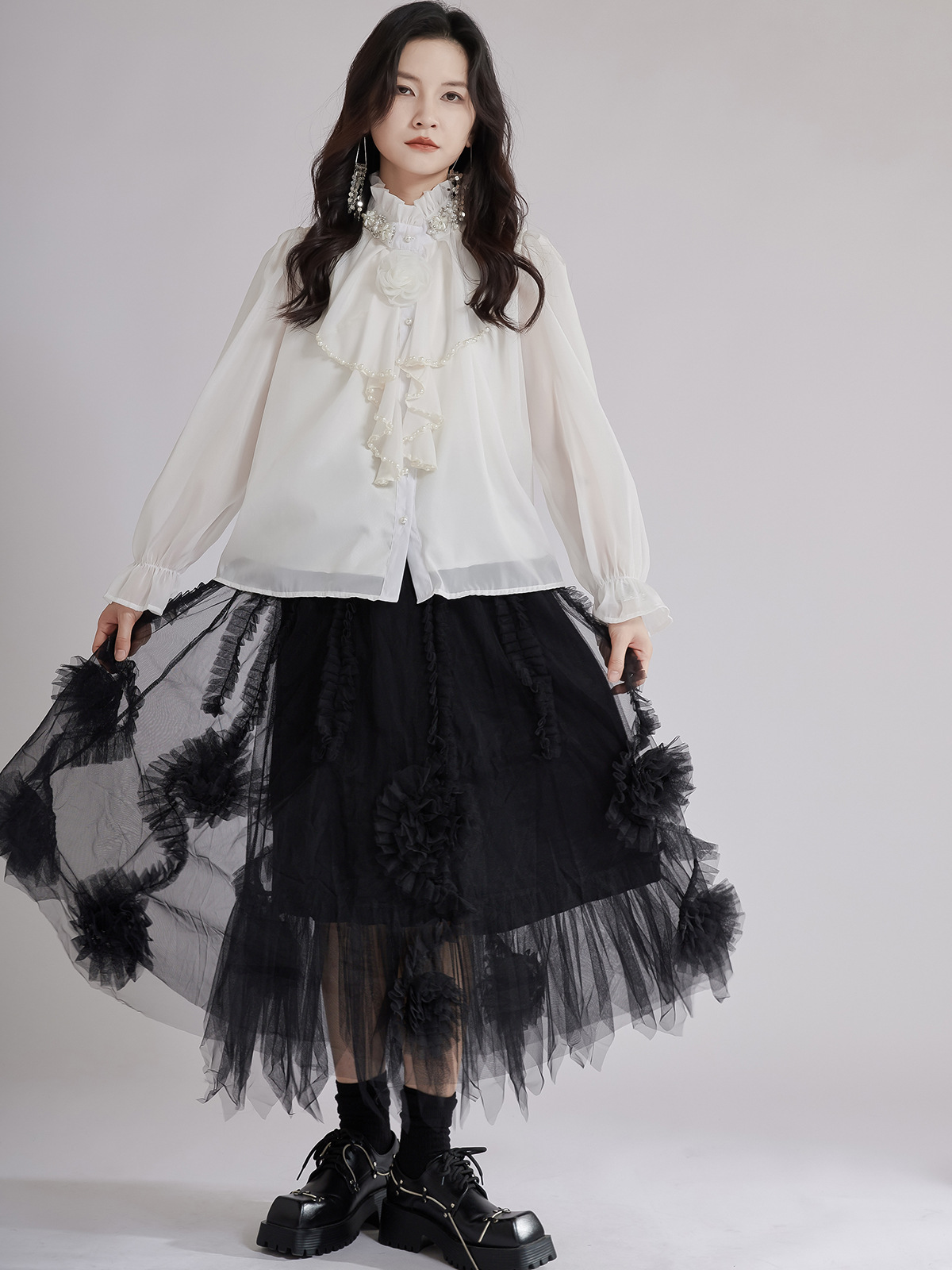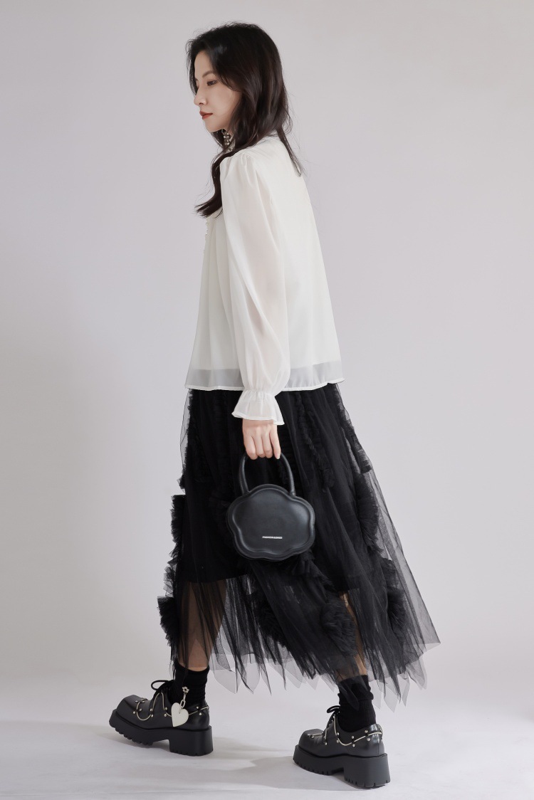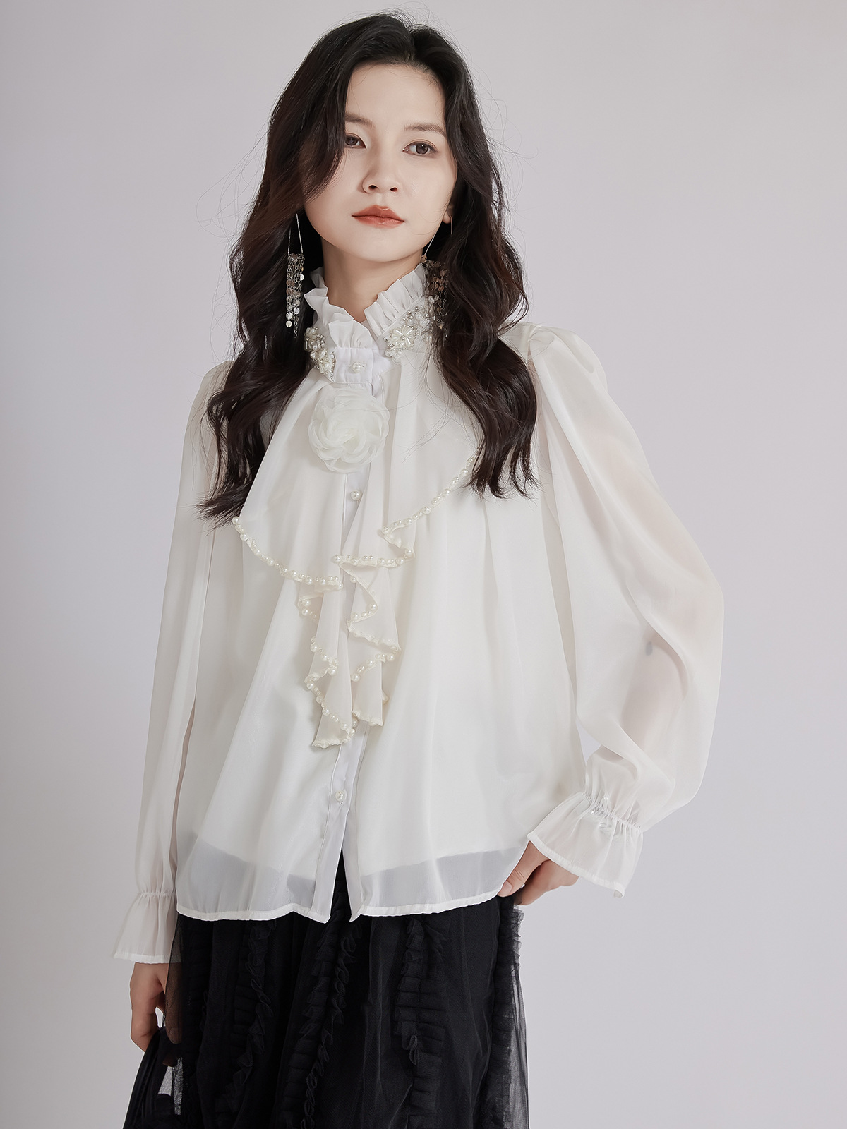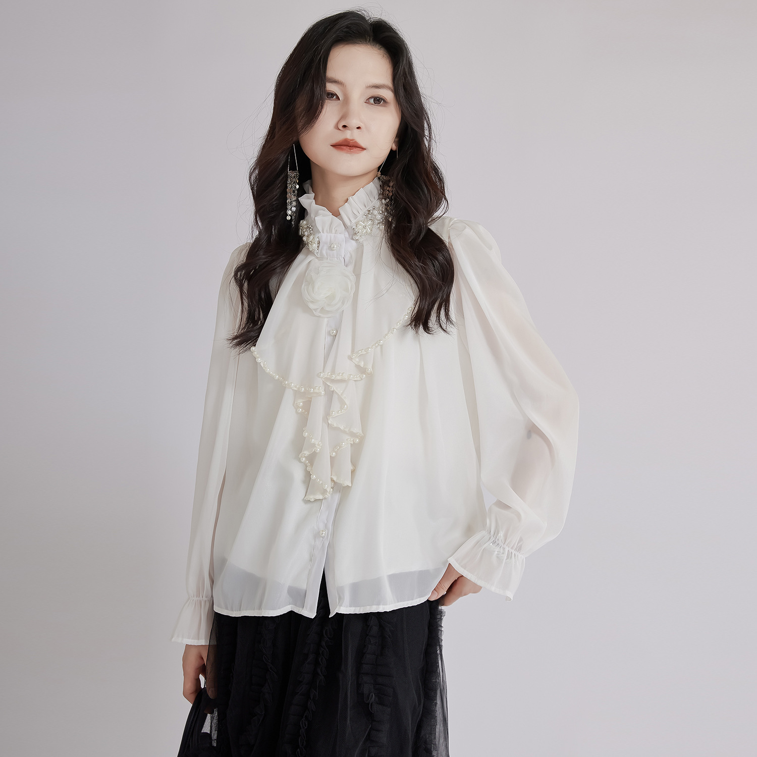 エレガントな立体花モチーフとフリル襟が印象的なブラウスです。 透け感のある上質な生地と繊細なレース使いで、フォーマルスーツにも合わせやすい一枚。 袖口のギャザーデザインが女性らしさを演出し、オフィスから特別な日まで幅広くご活用いただけます。