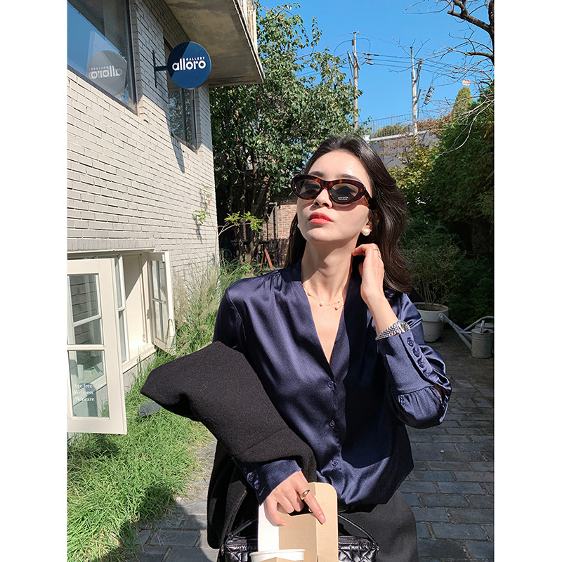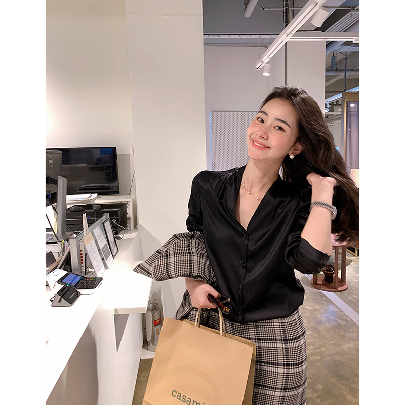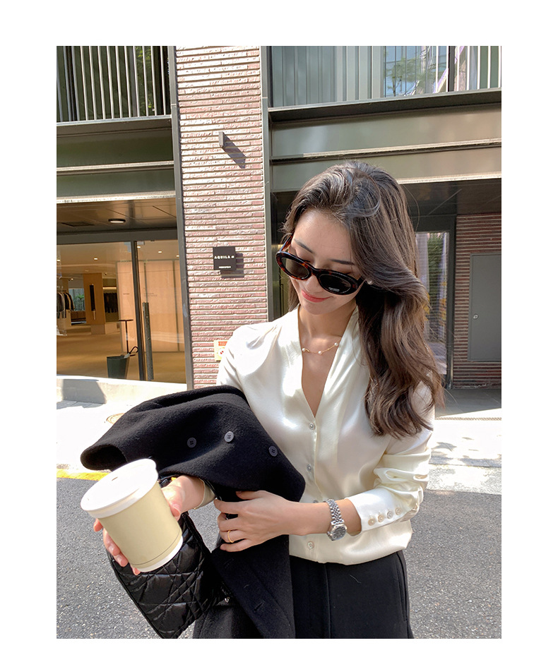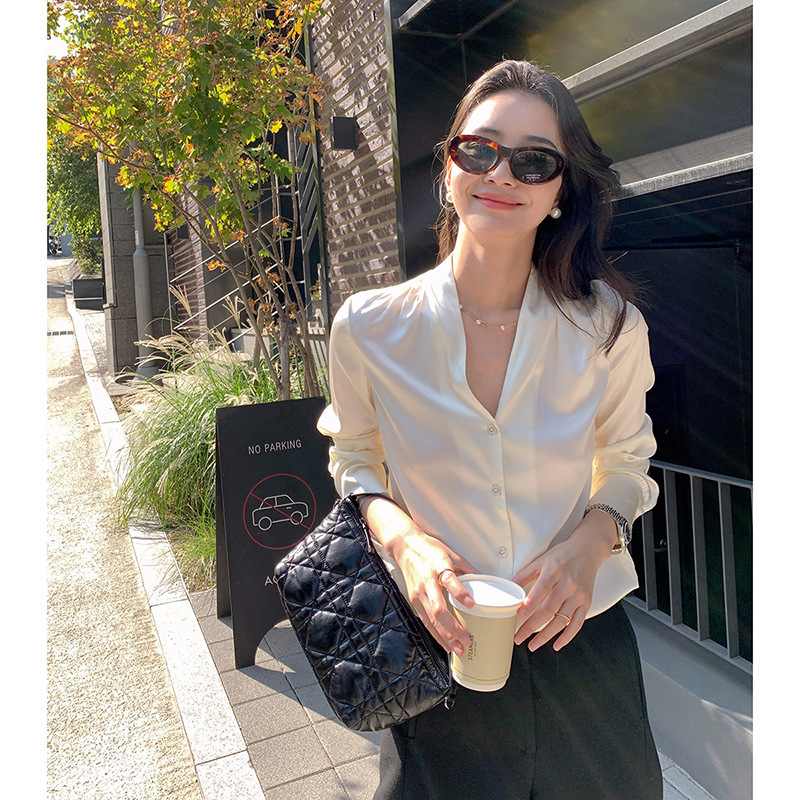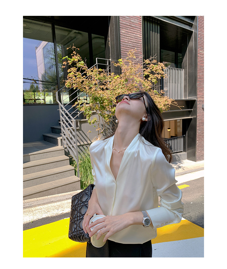 上質な素材を使用したエレガントなブラウスです。深めの襟元が洗練された印象を演出し、オフィスシーンに最適です。