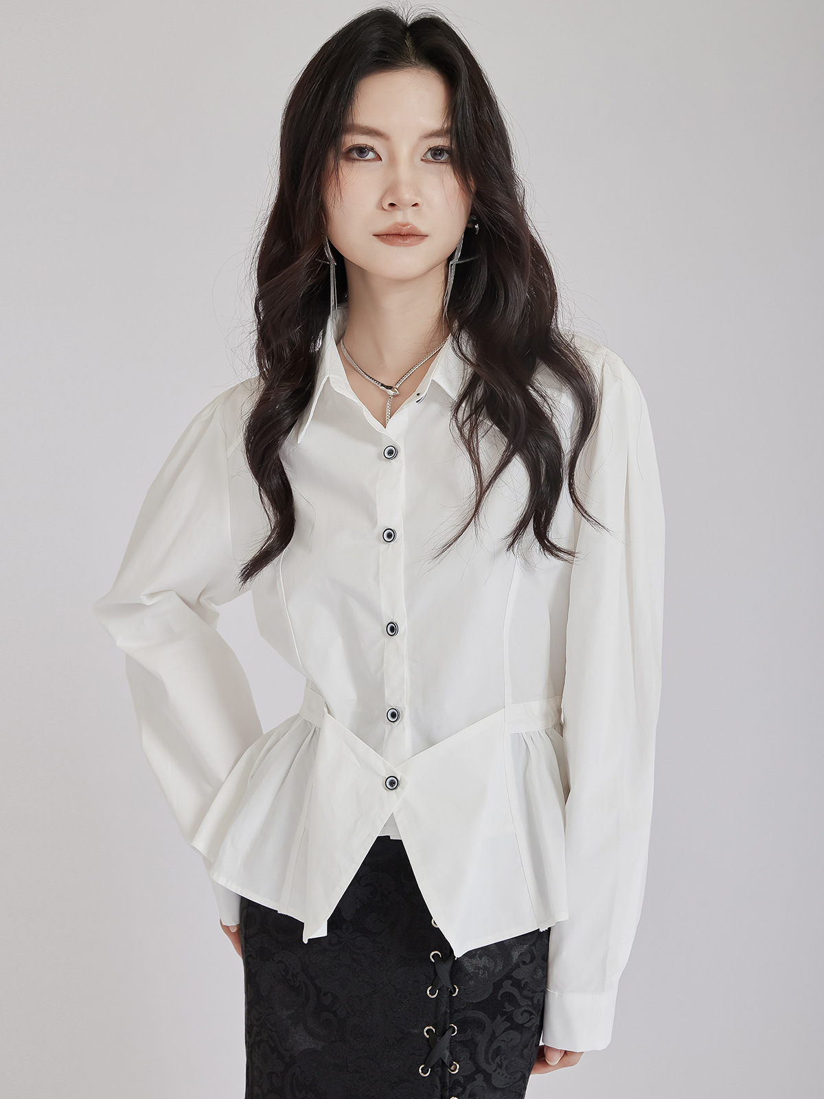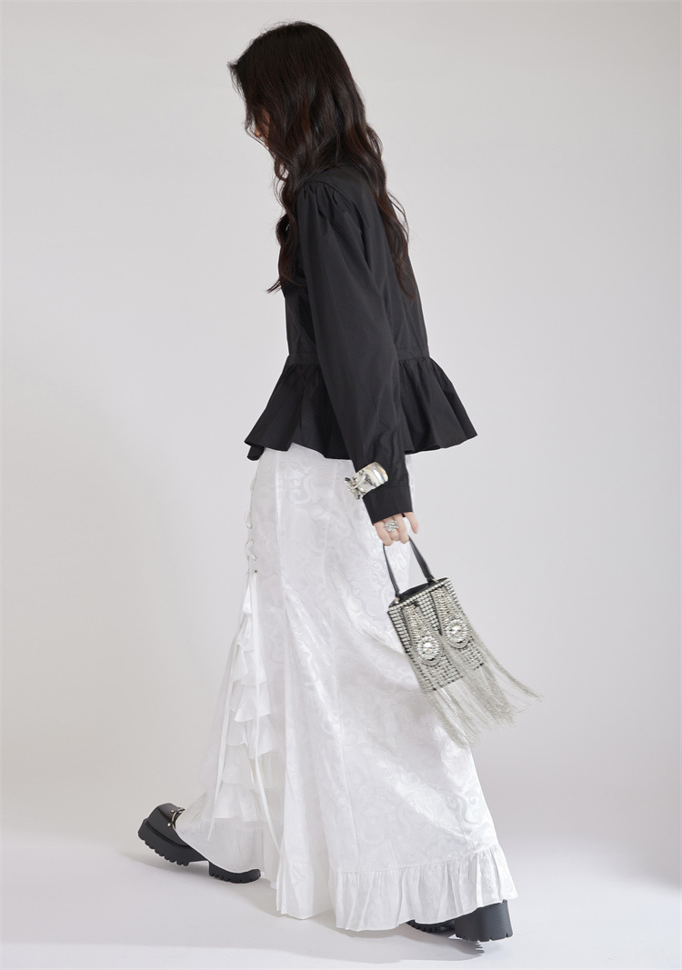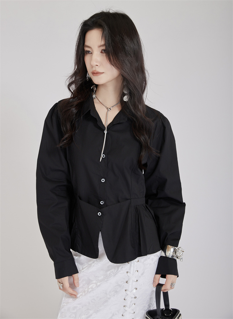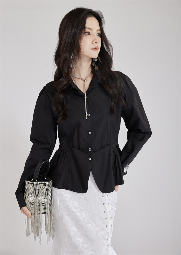 個性的なデザインが魅力的なウエストマーク白ブラウスです。 フォーマルスーツにも合わせやすく、ビジネスシーンから普段使いまで幅広く活躍します。 ウエスト部分のギャザーデザインがスタイルアップ効果を演出し、 上品で洗練された印象を与えるブラウスです。
