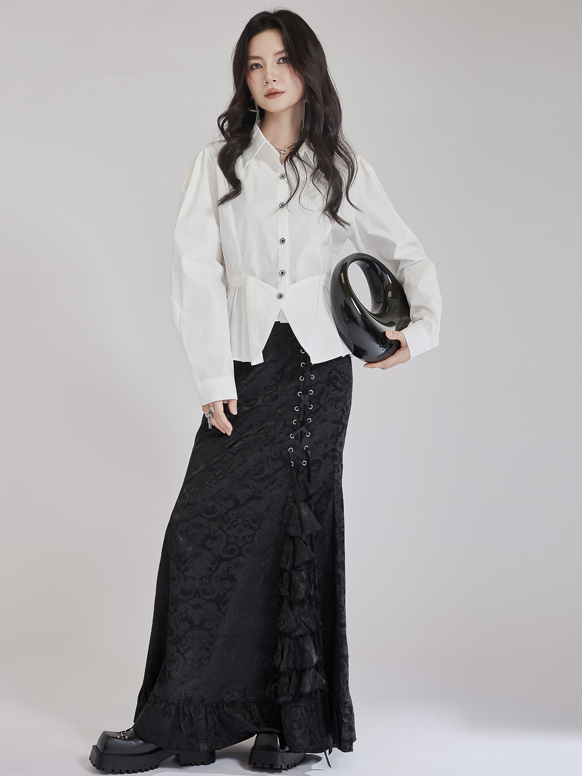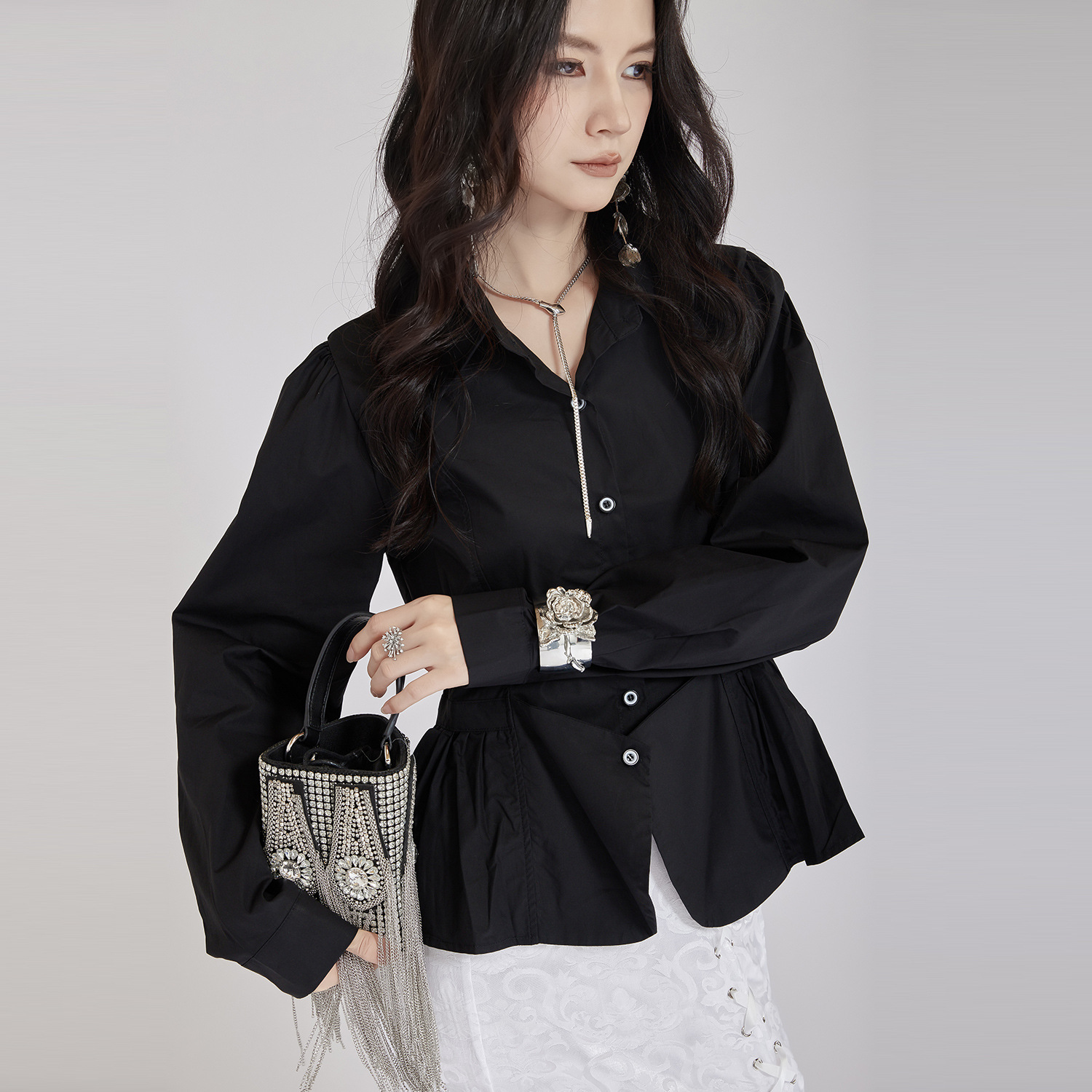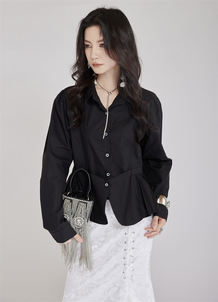 個性的なデザインが魅力的なウエストマーク白ブラウスです。 フォーマルスーツにも合わせやすく、ビジネスシーンから普段使いまで幅広く活躍します。 ウエスト部分のギャザーデザインがスタイルアップ効果を演出し、 上品で洗練された印象を与えるブラウスです。