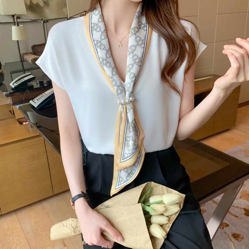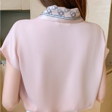 フォーマルスーツにも合わせやすい、上品なスカーフ付き半袖ブラウスです。