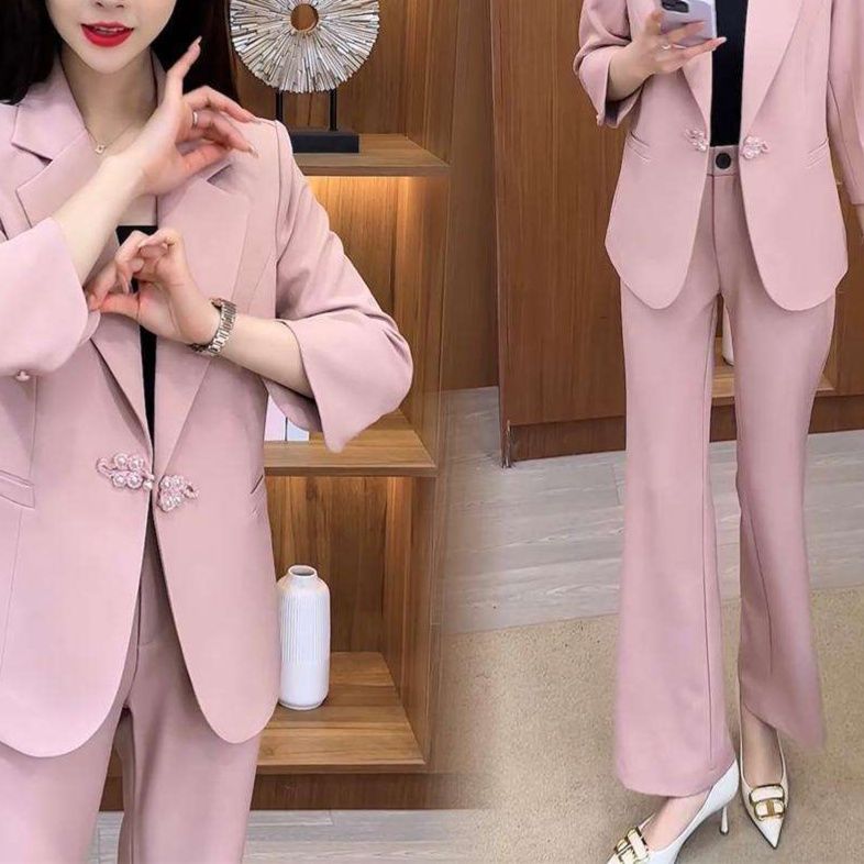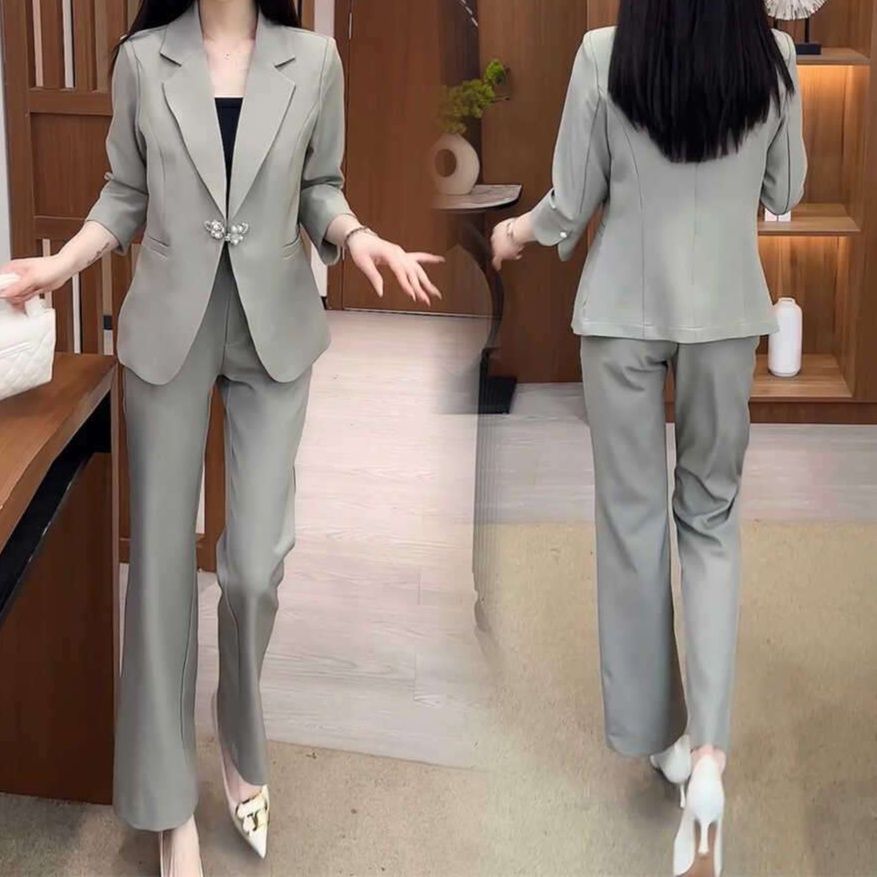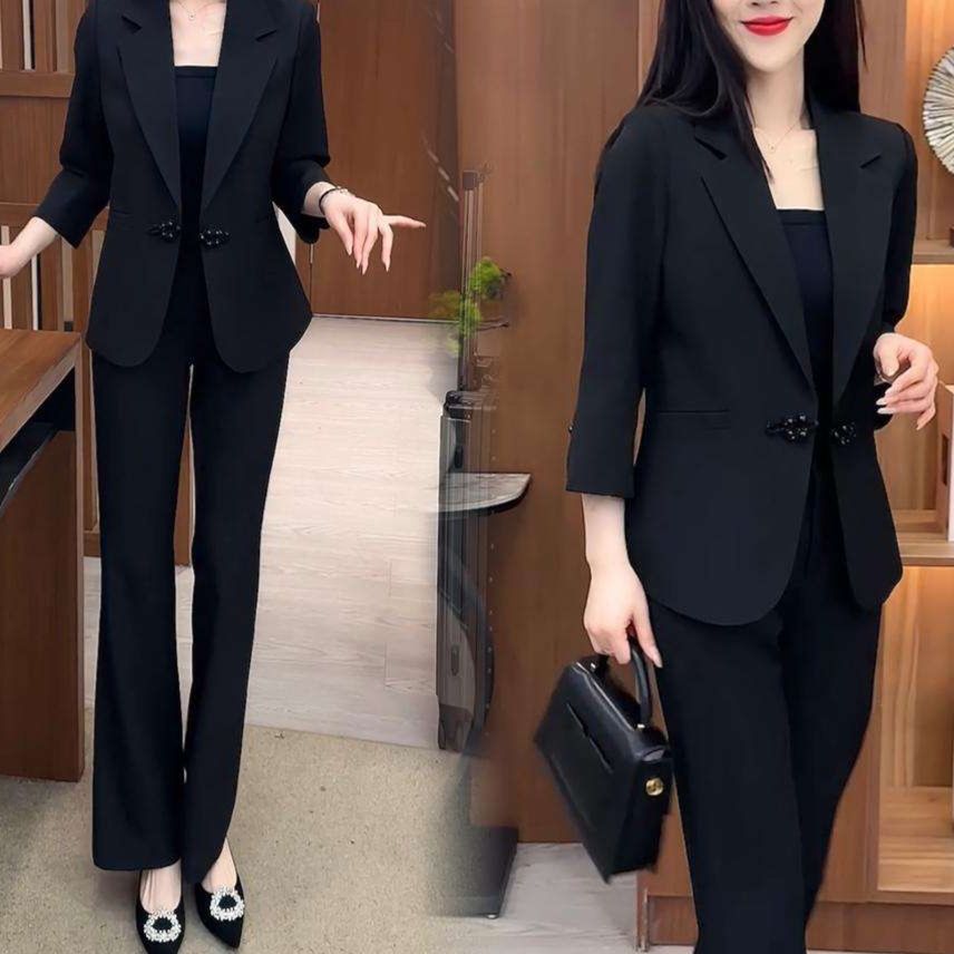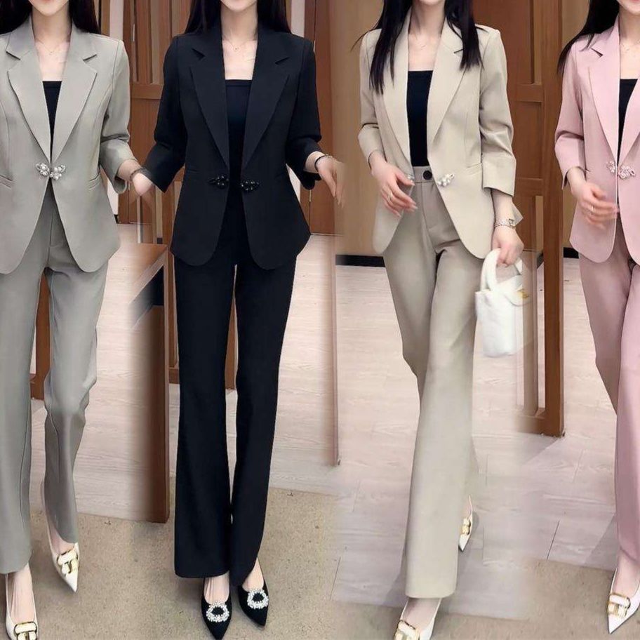 洗練されたデザインのレディースパンツスーツ。3分袖のジャケットと細身のパンツがセットになり、ビジネスシーンや公式な場面にぴったり。上品さと知性を兼ね備え、装飾的なボタンやアクセサリーで女性らしさを引き立てる一着。自信を持って着こなせるスタイルを提供します。