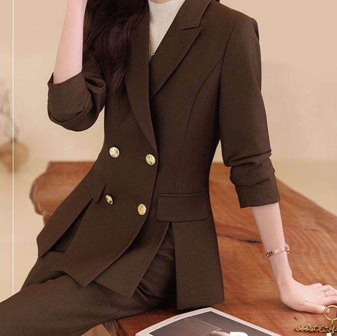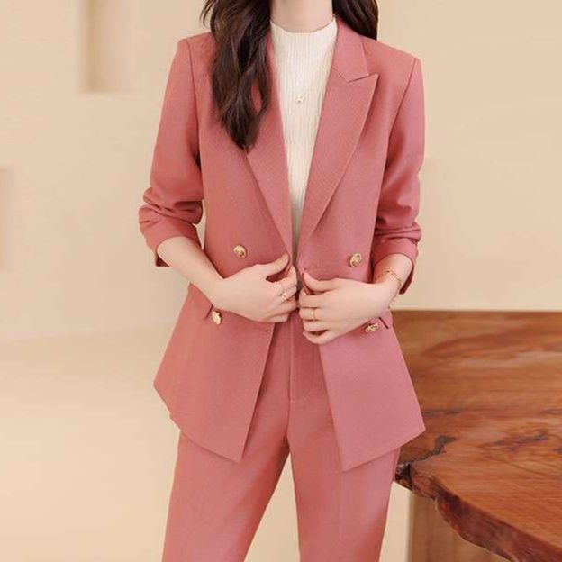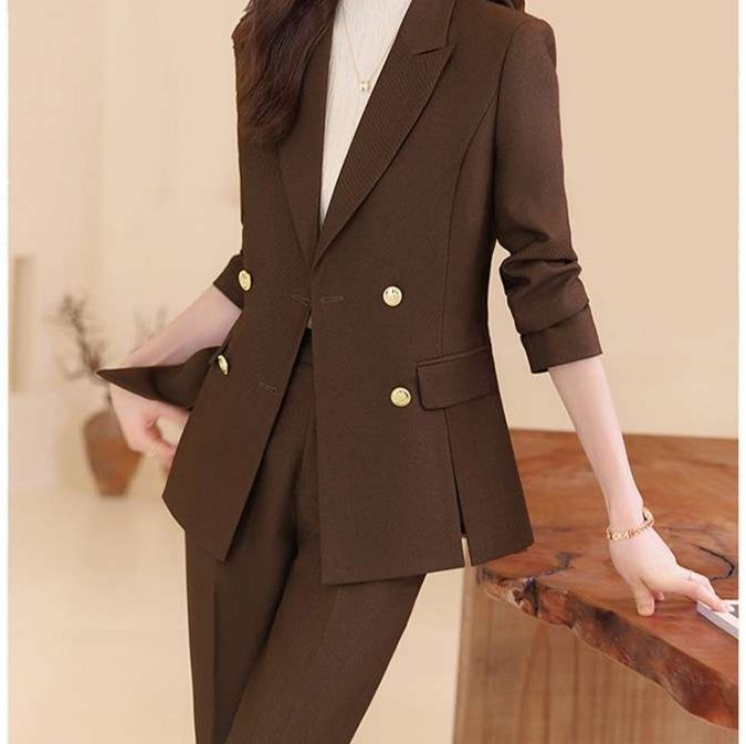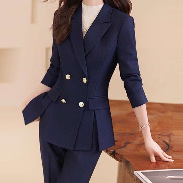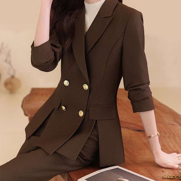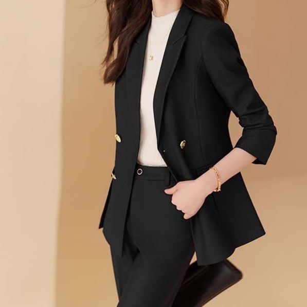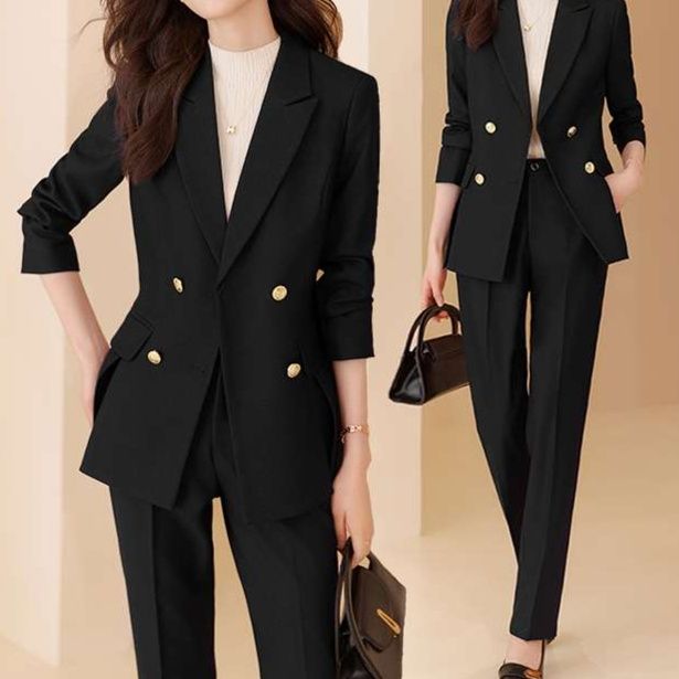 洗練されたダブルブレストデザインのレディースフォーマルスーツ。上品な金ボタンが魅力を引き立て、明るいインナーとのコントラストが際立つ一着。オフィスや特別なイベントでの着用に最適。細身のシルエットが女性らしいラインを強調し、華やかさを添える。自信を持って着こなせるフォーマルスタイルを提供します。どんなシーンでも際立つ存在感を演出。