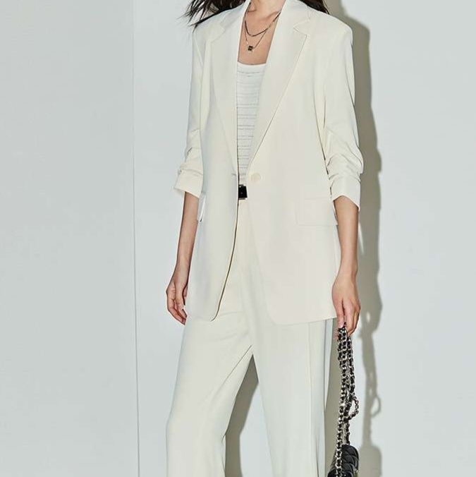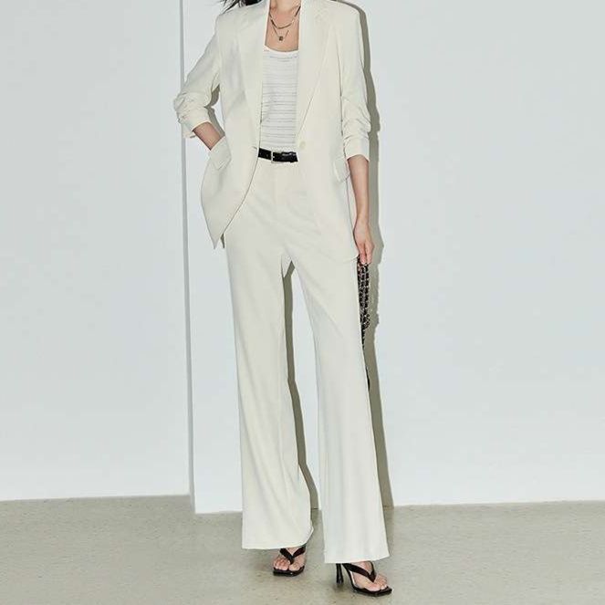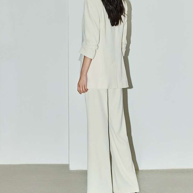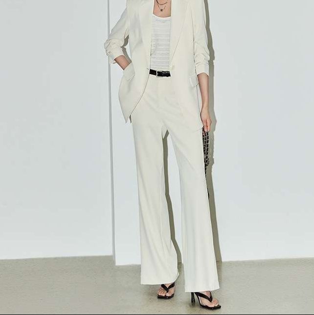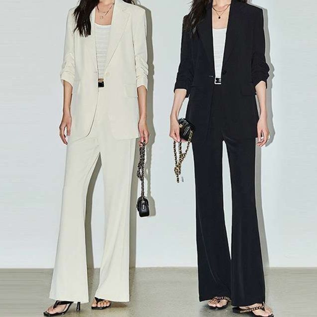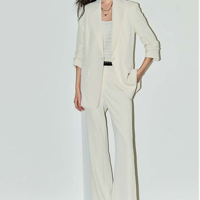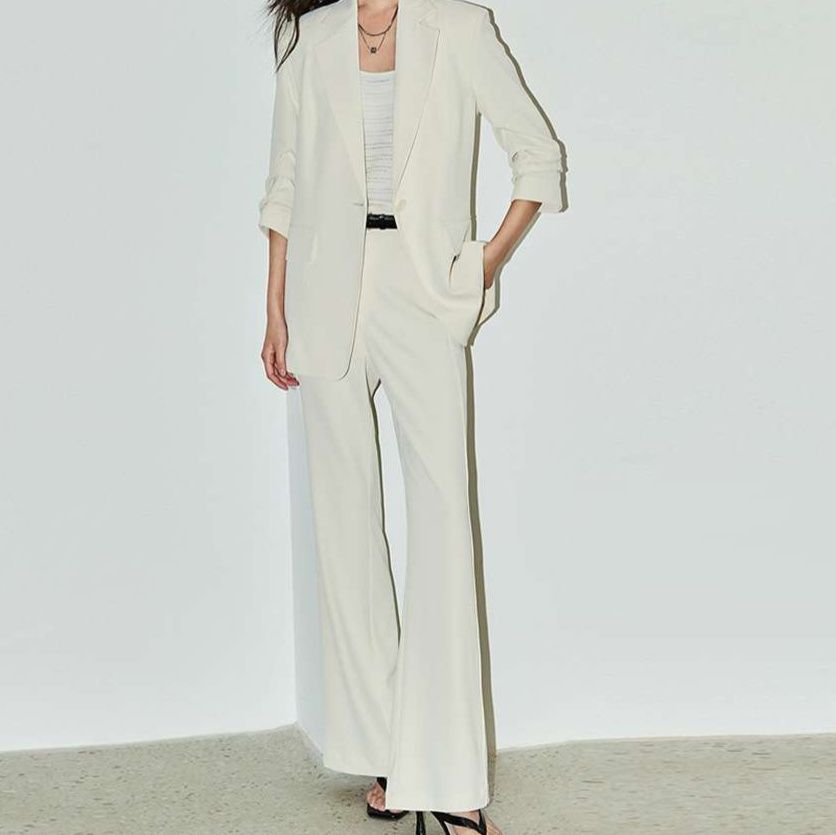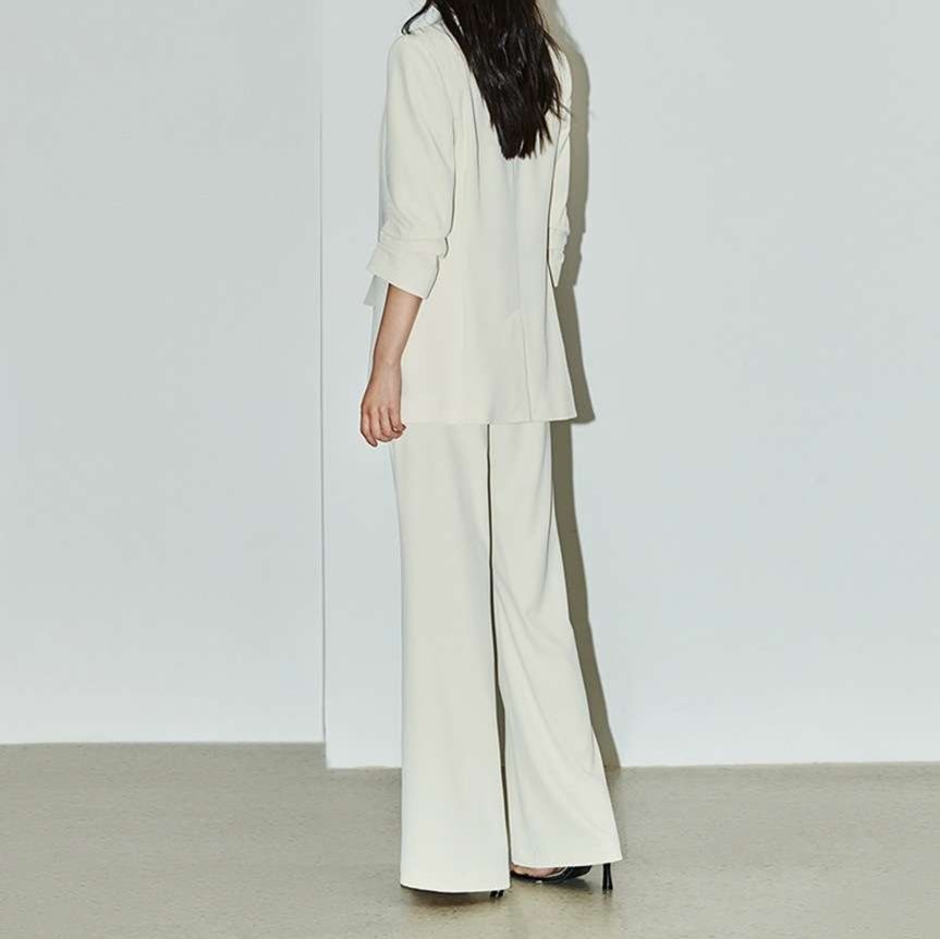 洗練されたシルエットのジャケットとワイドパンツがセットになったレディースフォーマルスーツ。上品な光沢感のある生地を使用し、オフィスからパーティーシーンまで幅広く対応。ジャケットの袖はロールアップ可能で、カジュアルなスタイルにもアレンジできる多様性あるデザインが魅力。自信を持って着こなせる一着。