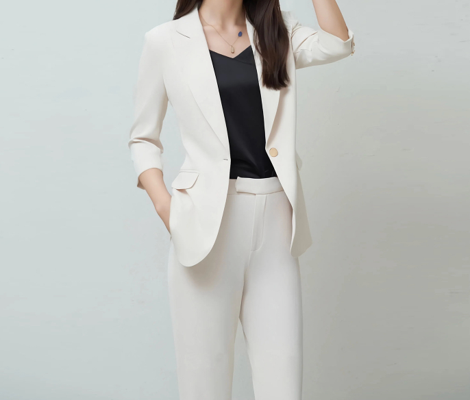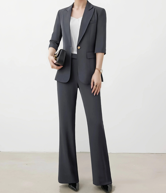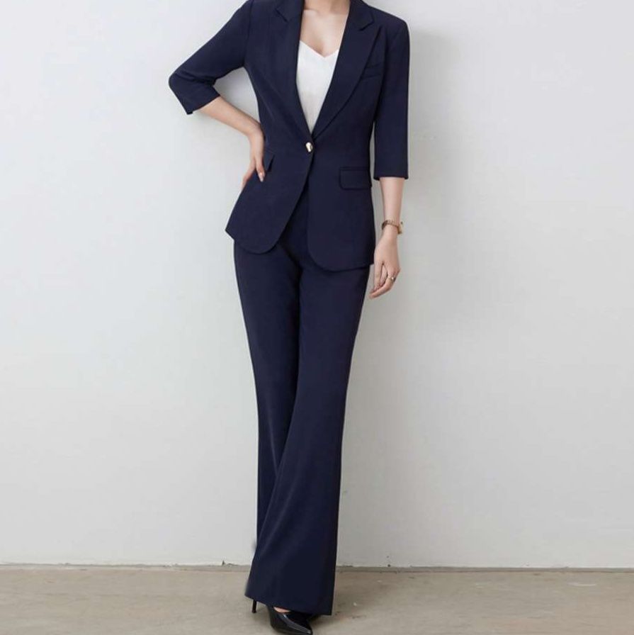 洗練されたシルエットの七分袖ジャケットとワイドパンツのセットアップは、フォーマルな場面に最適。上品なデザインがオフィスや式典での存在感を引き立てます。ゴールドのボタンが魅力的なアクセントとなり、高級感を演出。エレガントな印象を与えつつ、動きやすさも兼ね備えた一着です。自信を持って着こなせるスタイルが、あなたの魅力を引き出します。