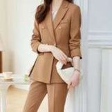 洗練された女性向けフォーマルスーツのセットアップです。ダブルブレストジャケットは美しいラペルと装飾的なボタンが特徴で、エレガントな印象を与えます。裾が広がったパンツとのコーディネートは、オフィスやフォーマルなシーンにぴったり。上質な素材を使用し、女性らしさと知的な魅力を引き立てる高品質な一着です。自信を持って着こなせる、洗練されたスタイルをお楽しみください。