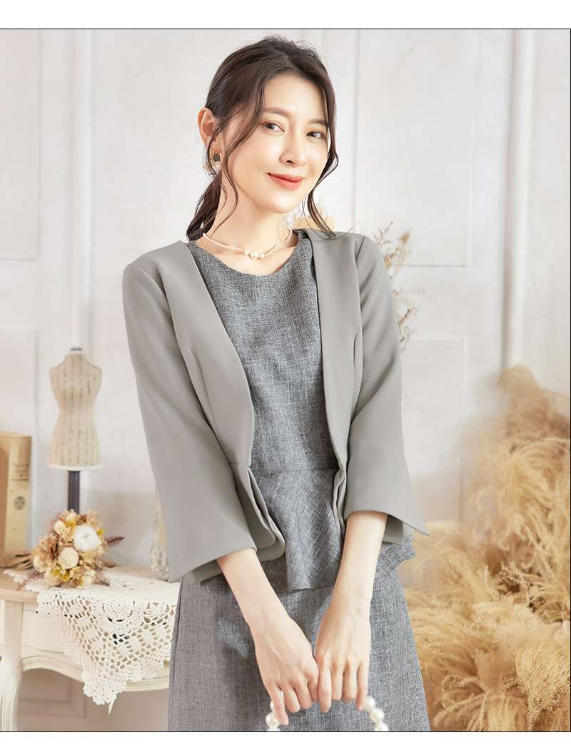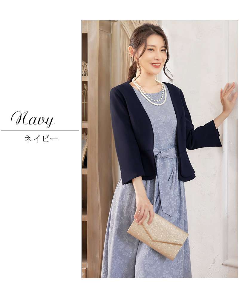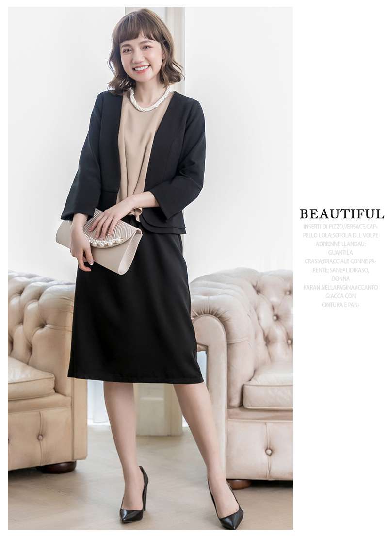 レディース向けフォーマルスーツとして洗練された上着とワンピースのセットアップ。
